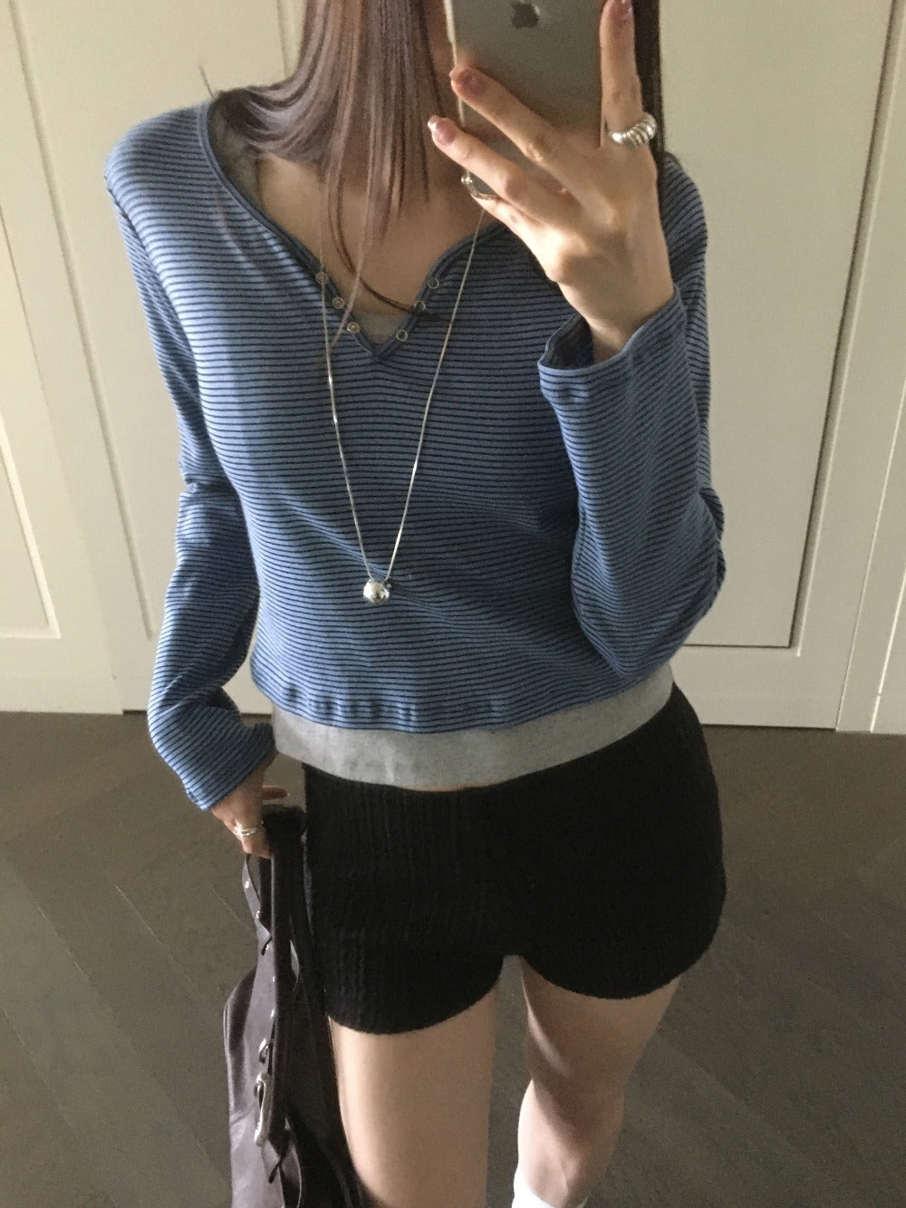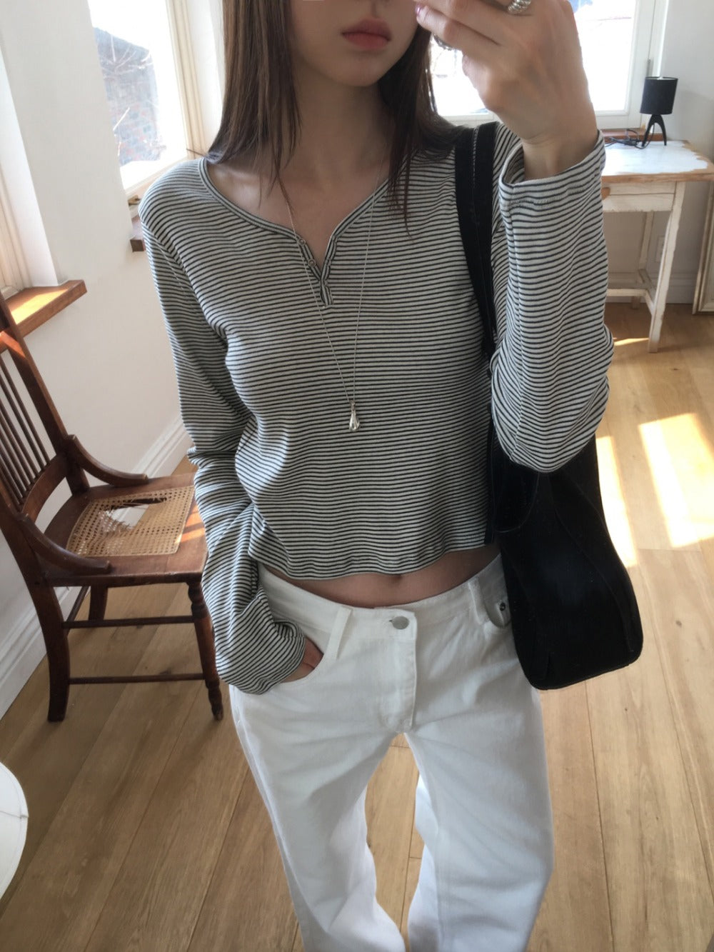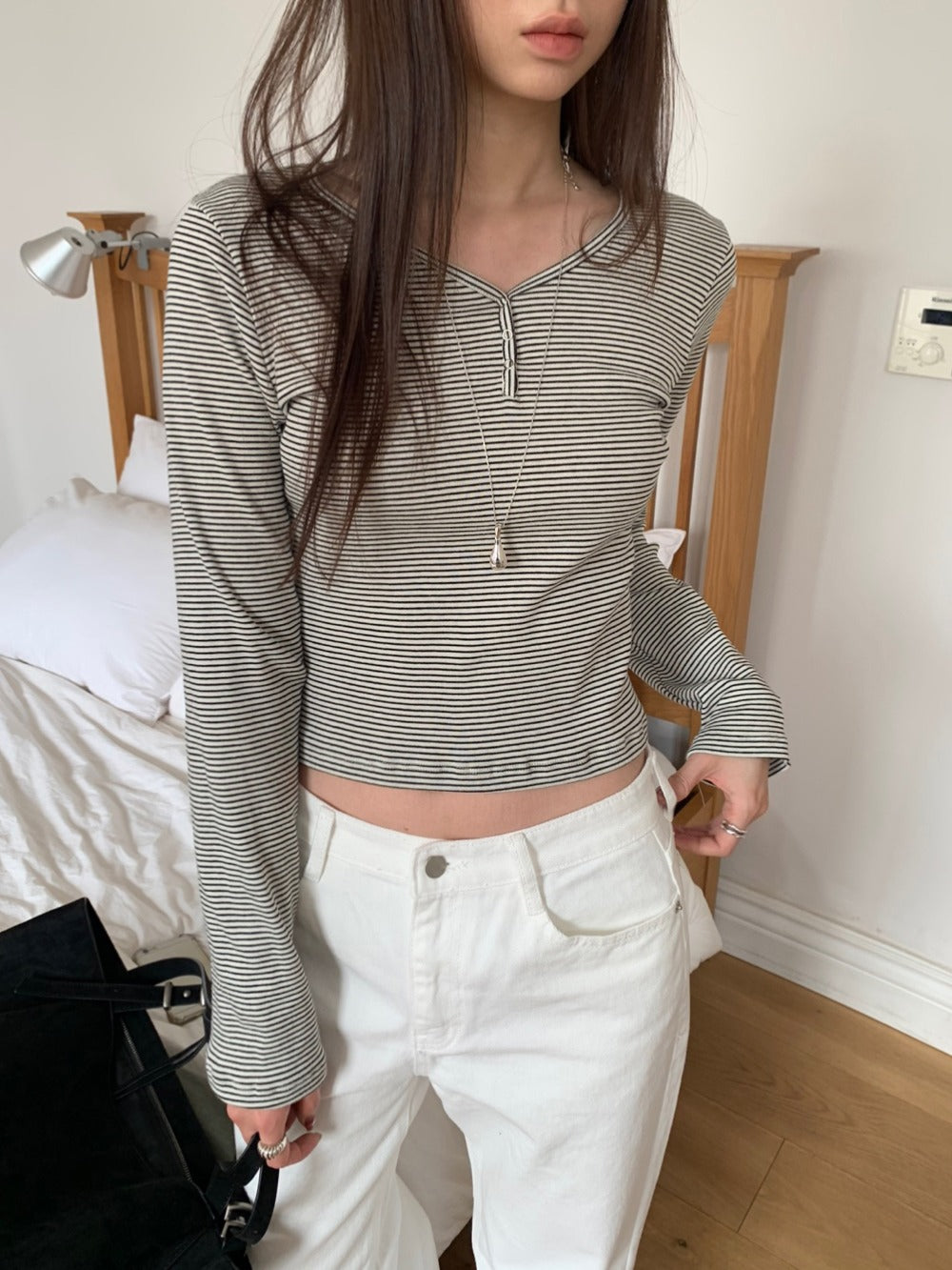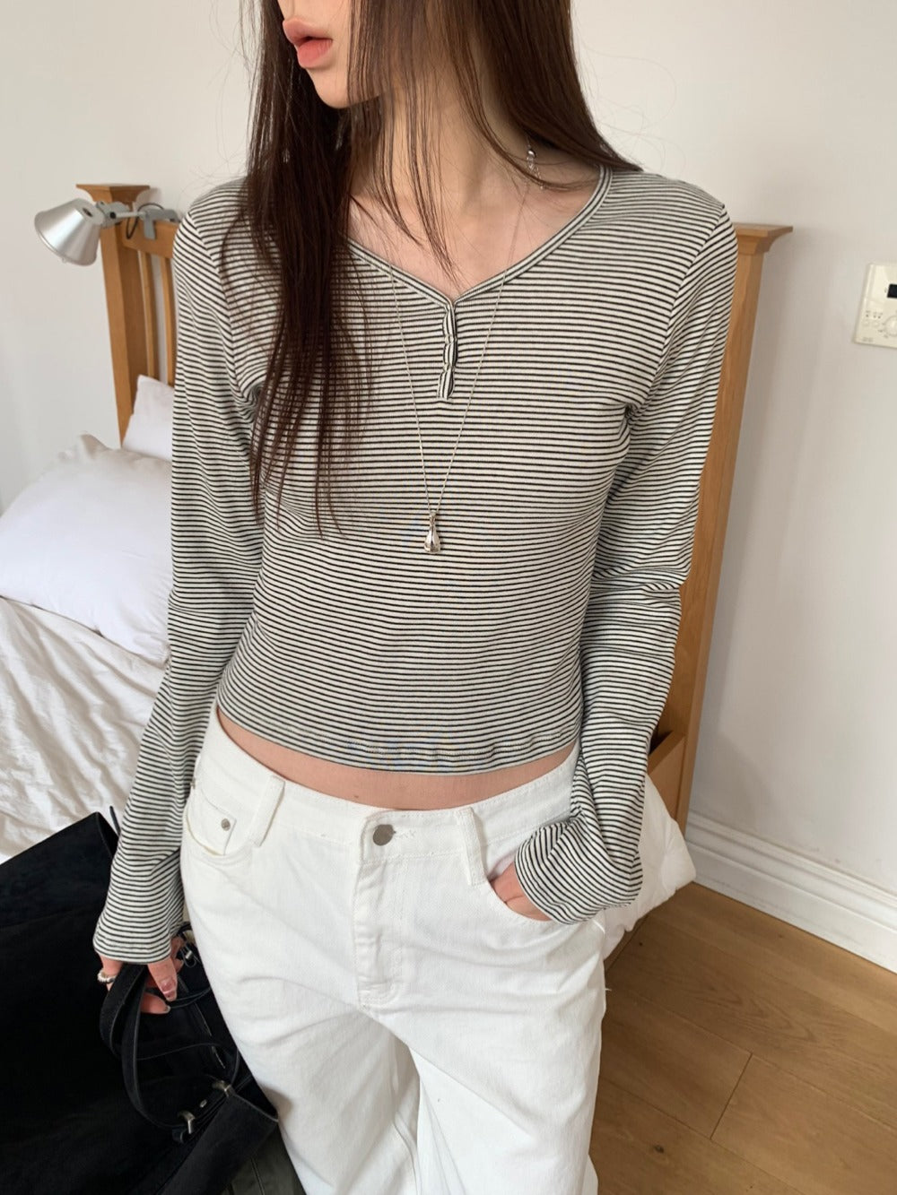 條紋V領暗扣細節上衣