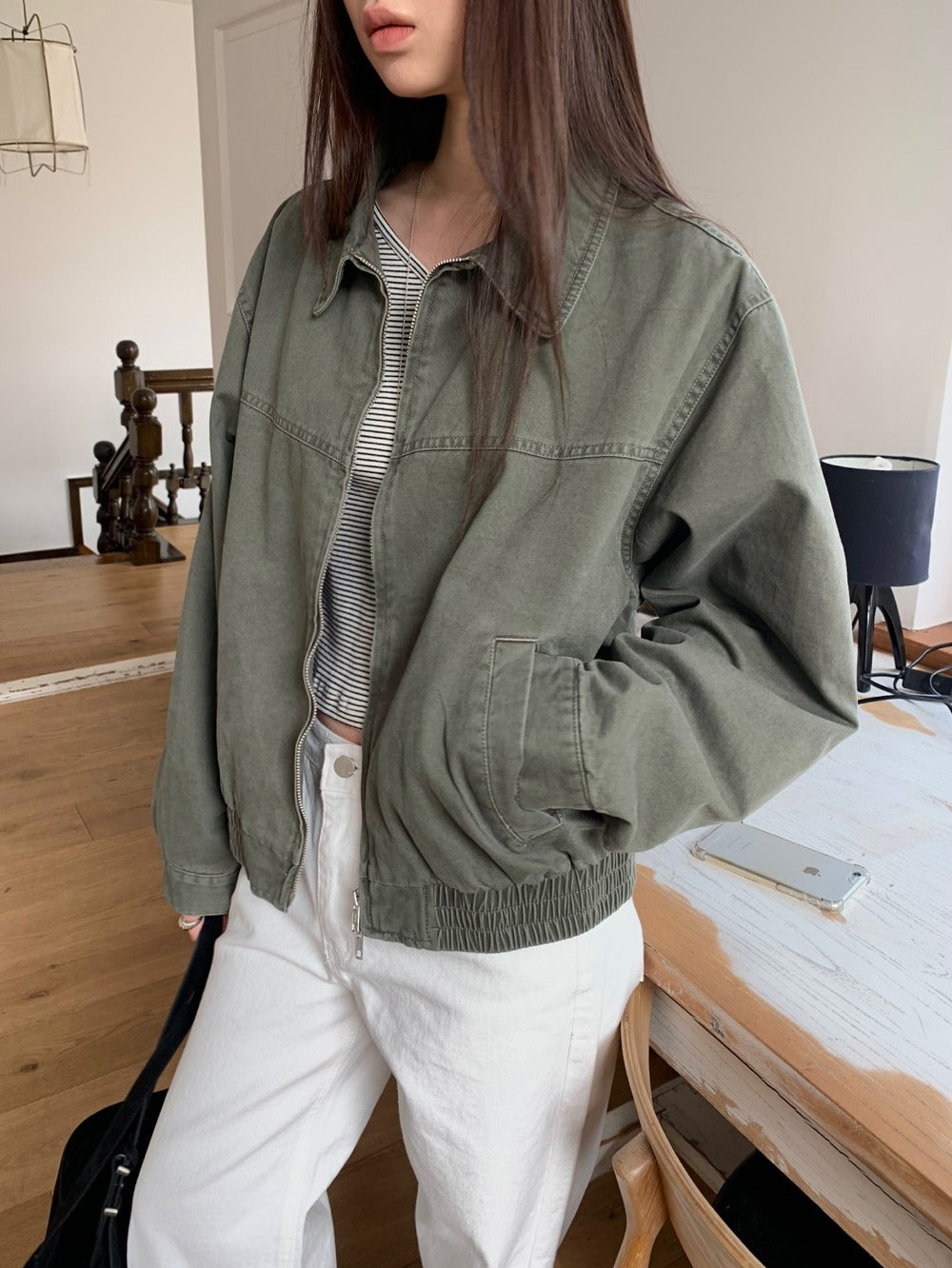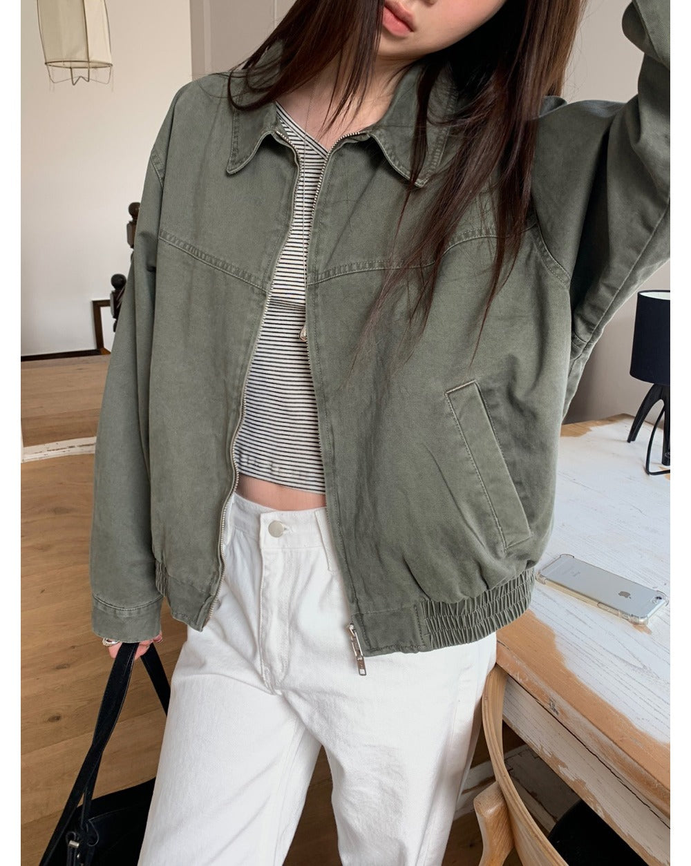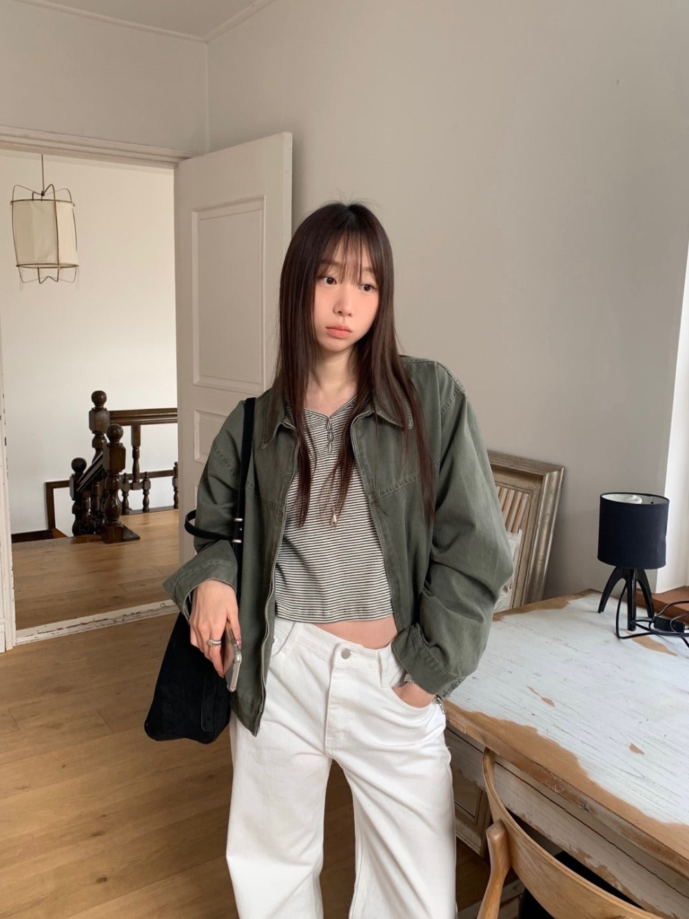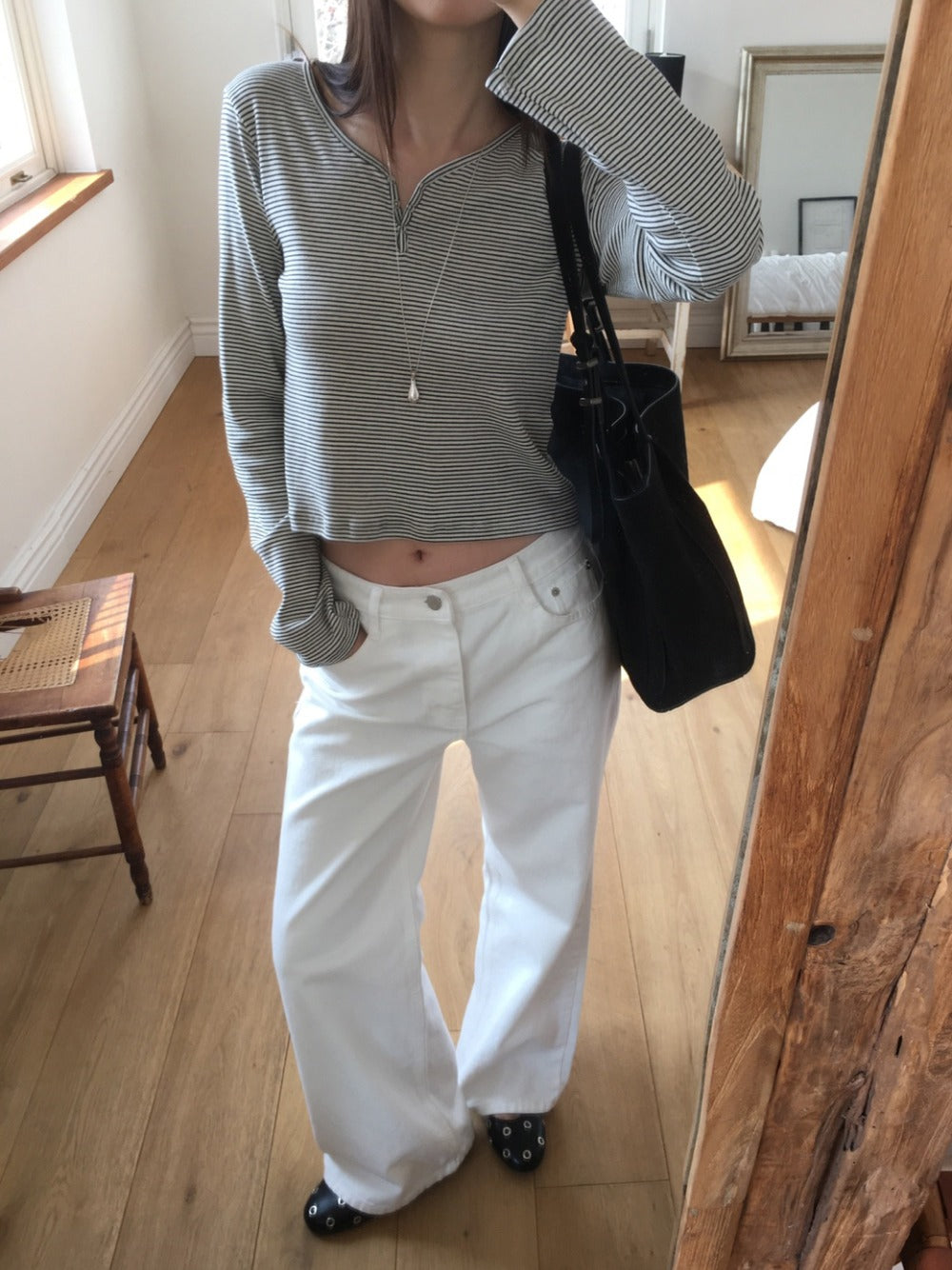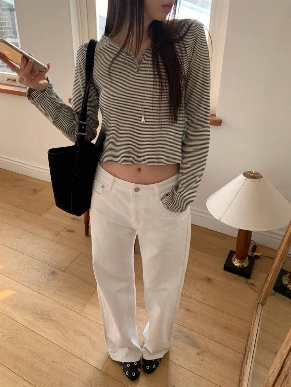 條紋V領暗扣細節上衣