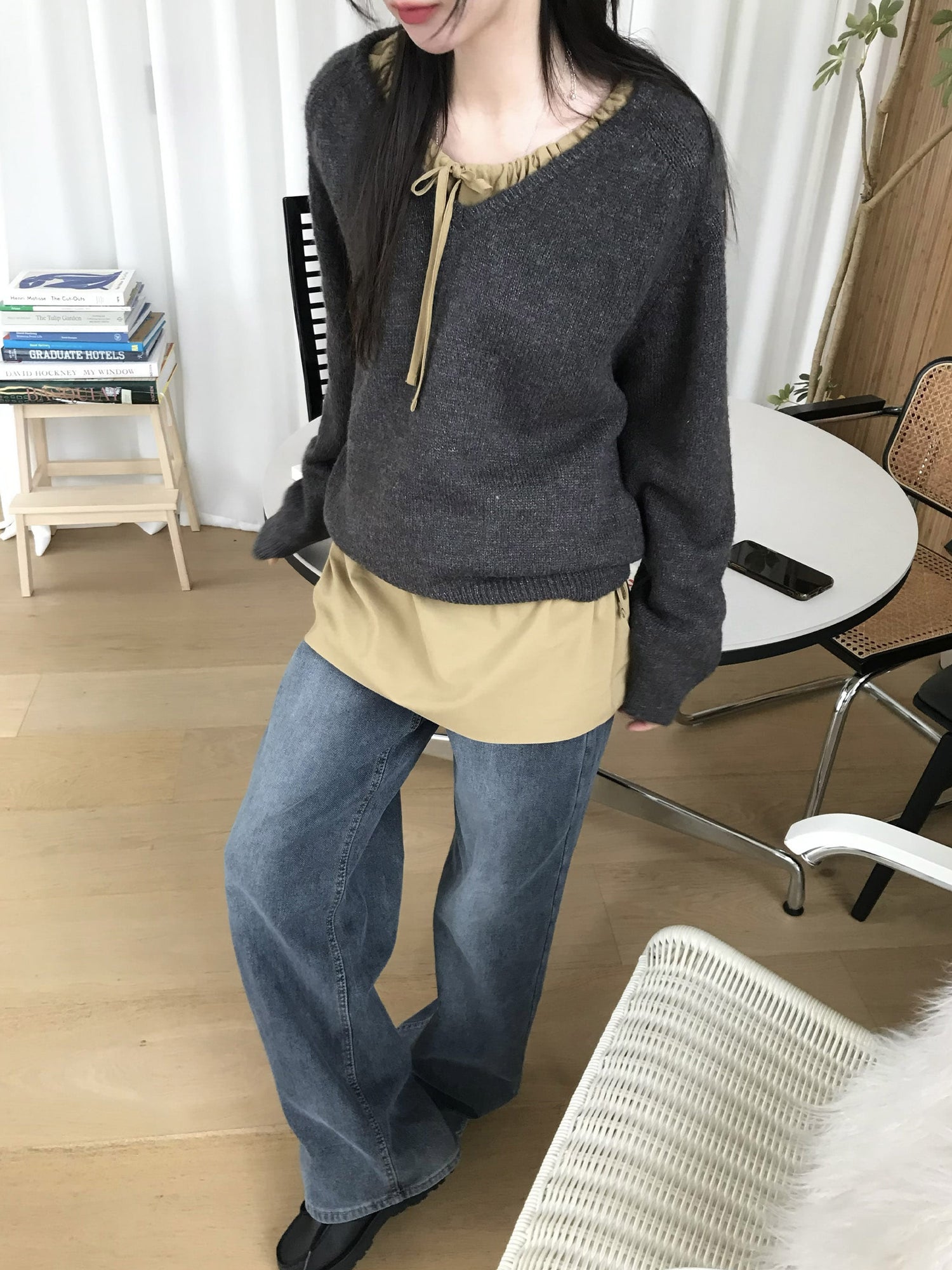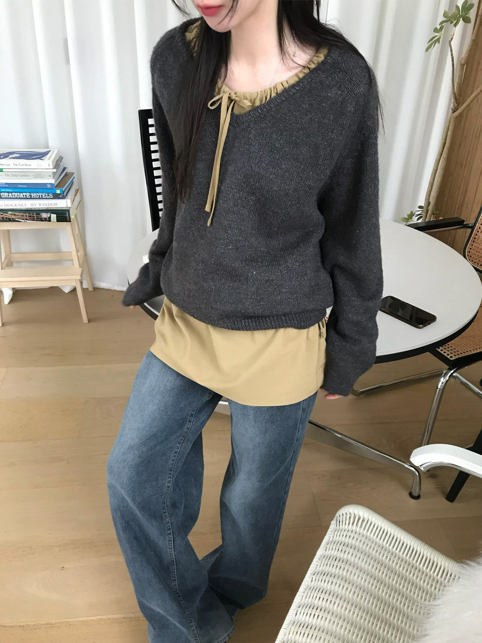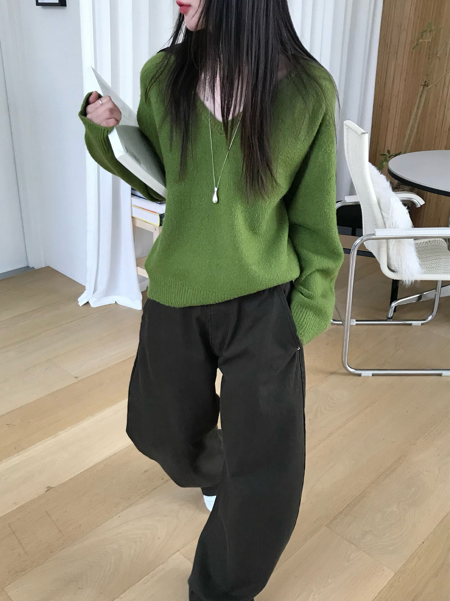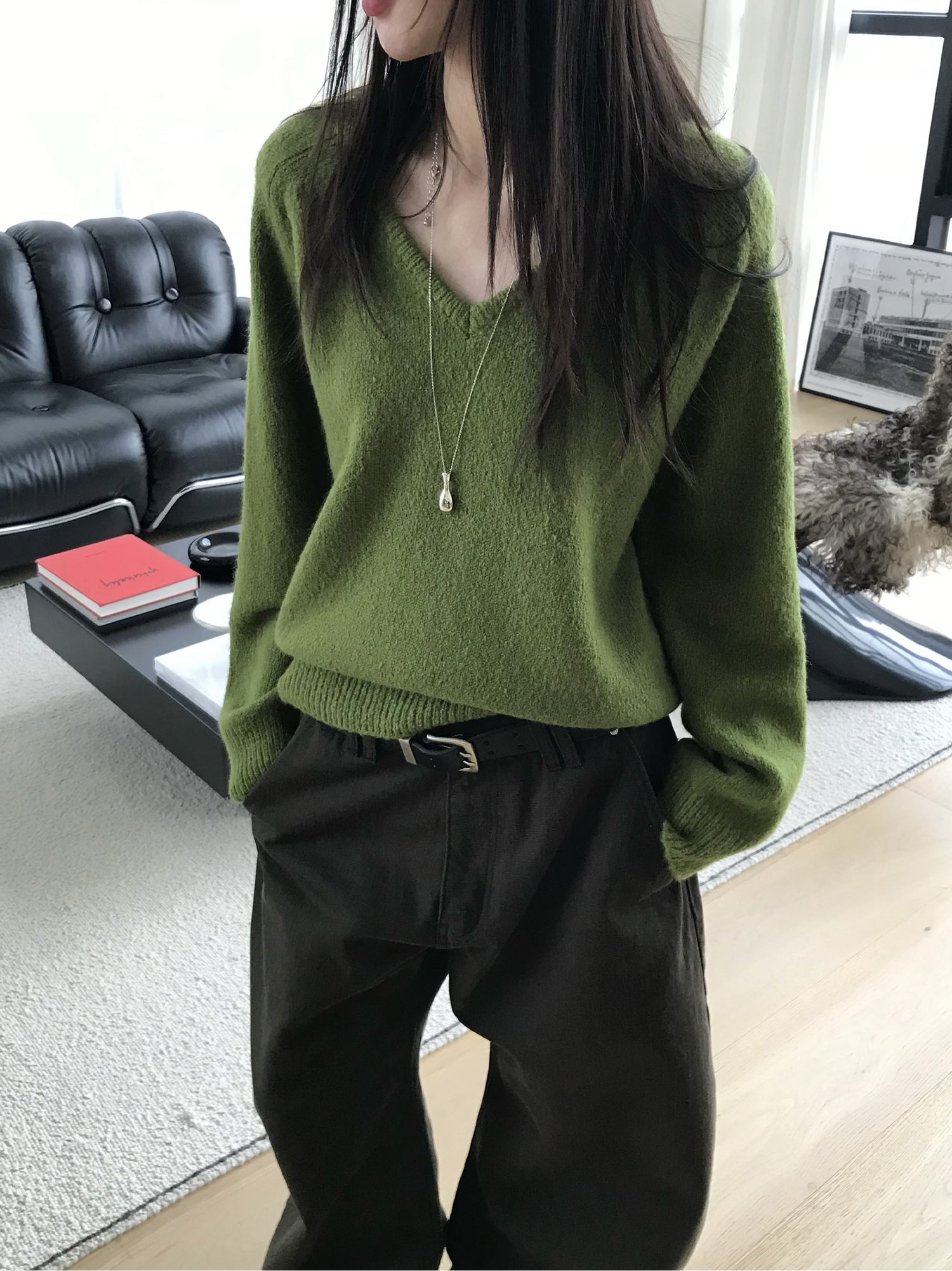 V領美肩線細節針織毛衣