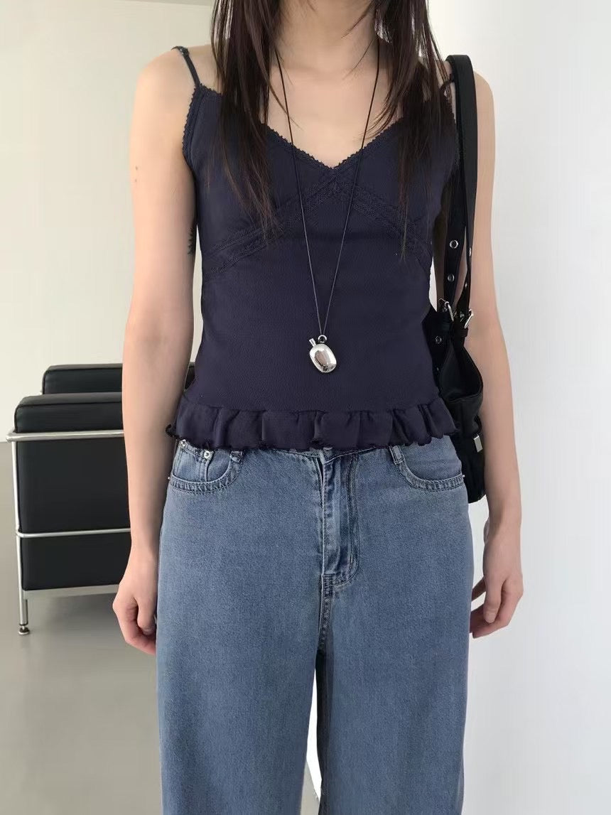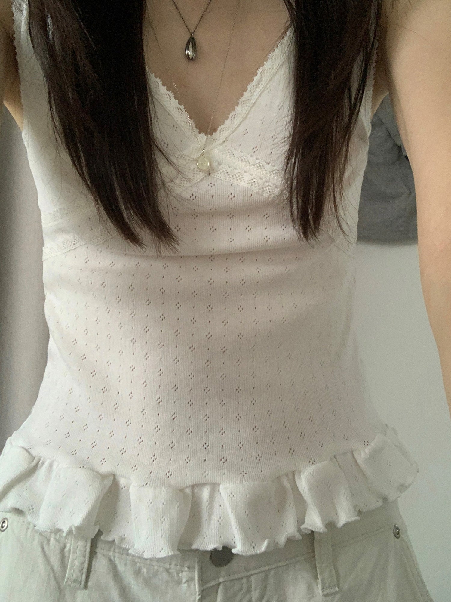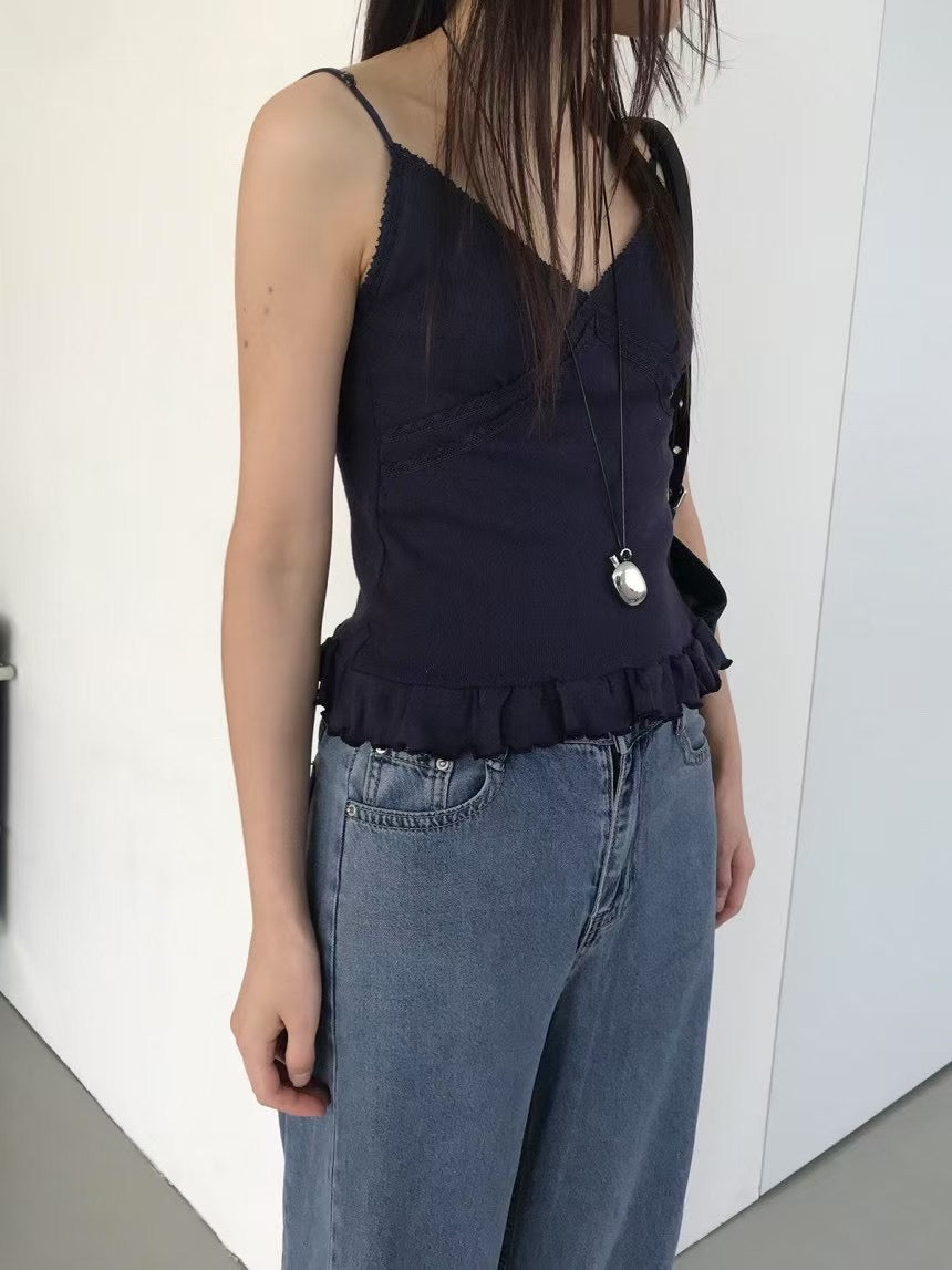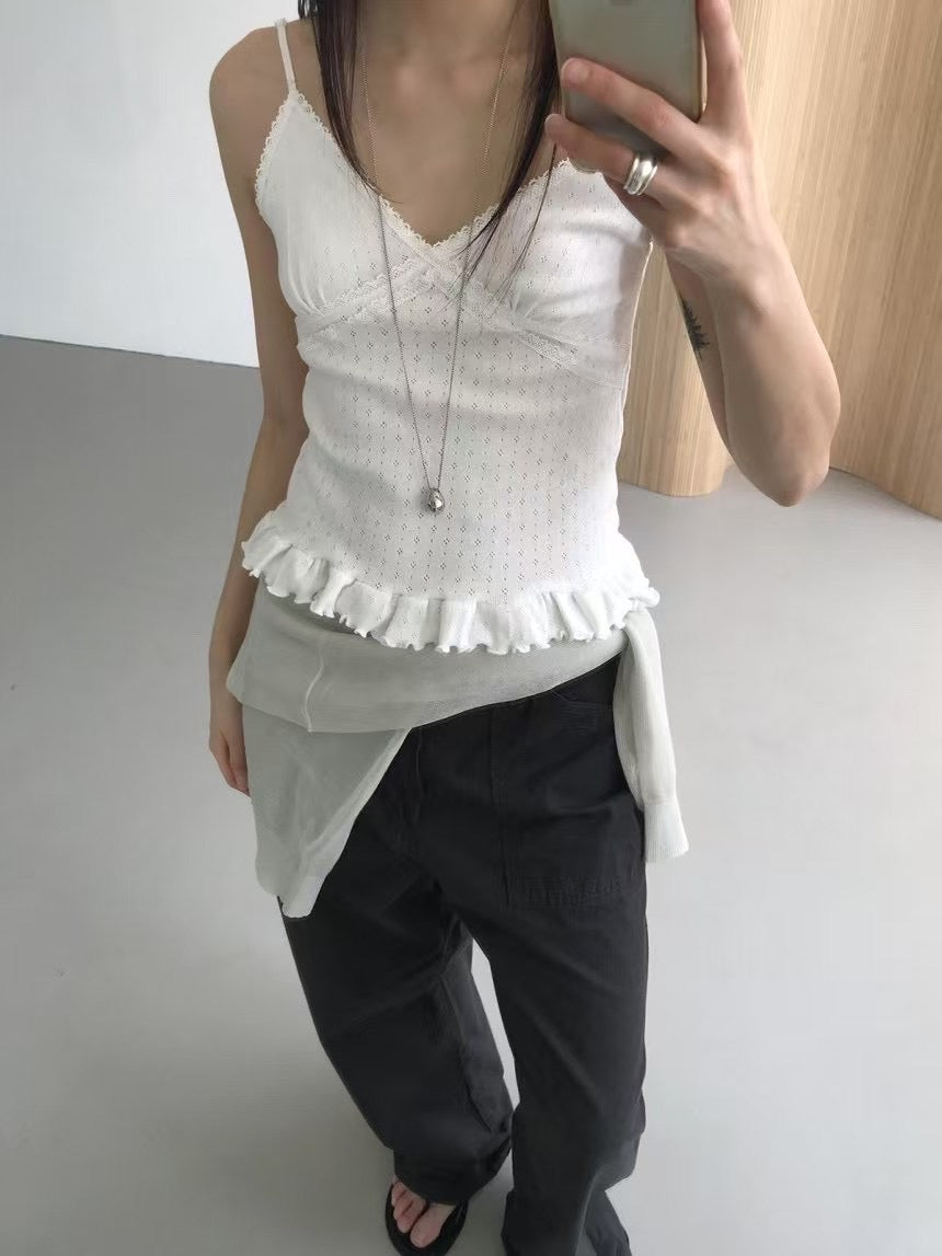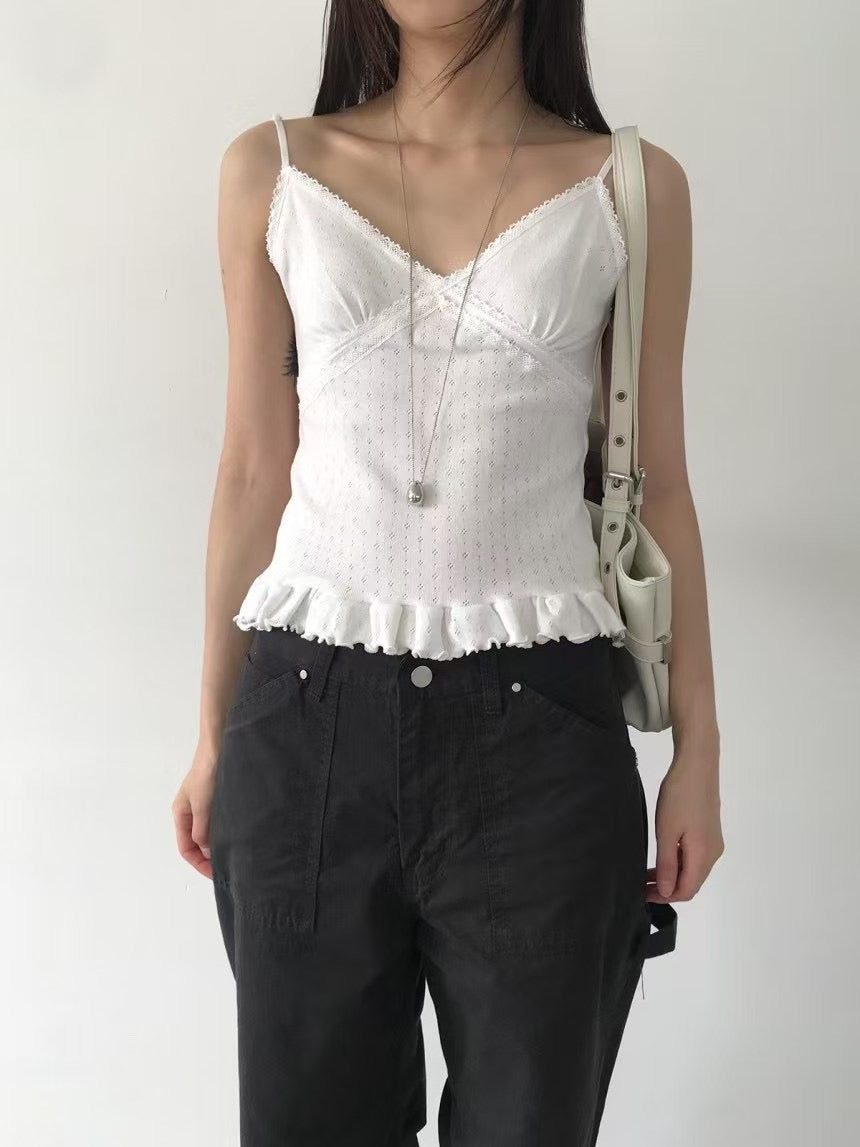 壓花蕾絲胸線細節荷葉邊背心