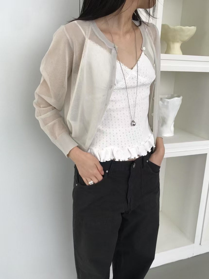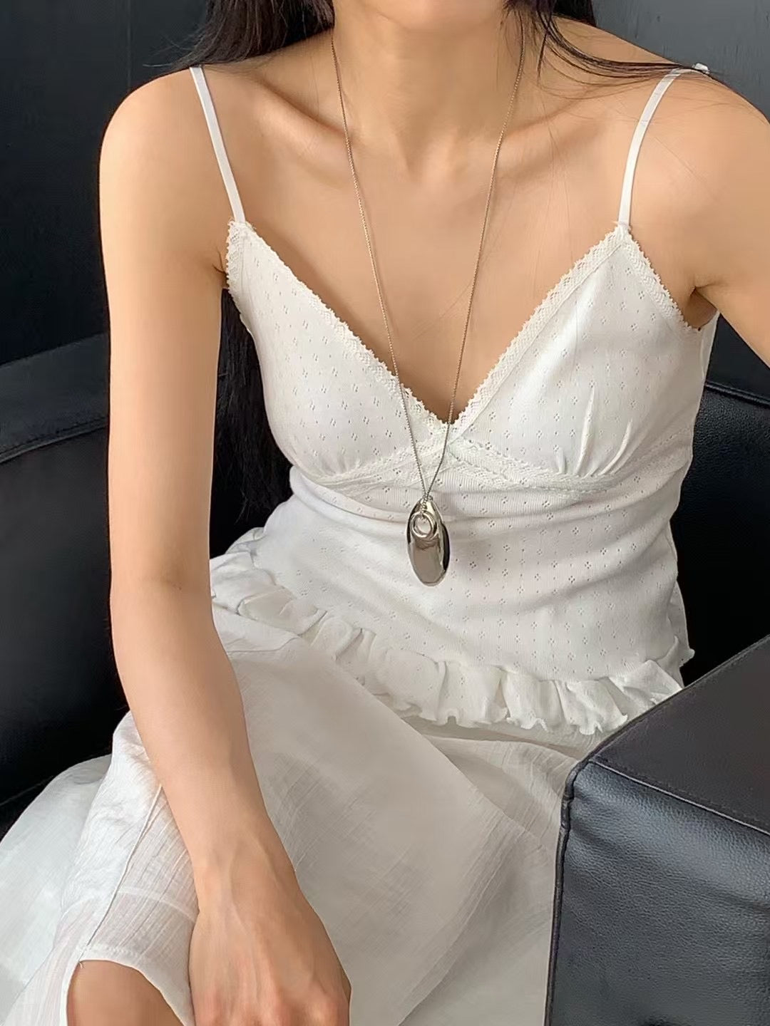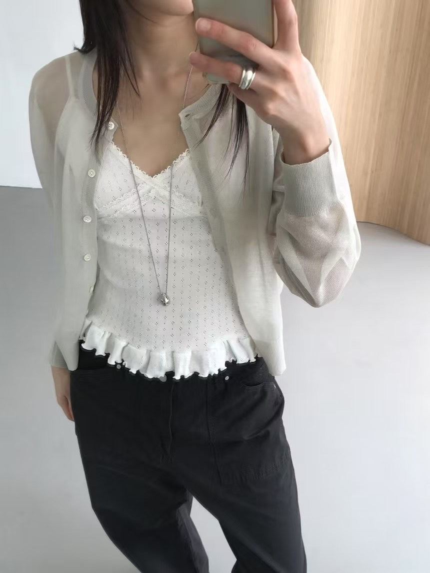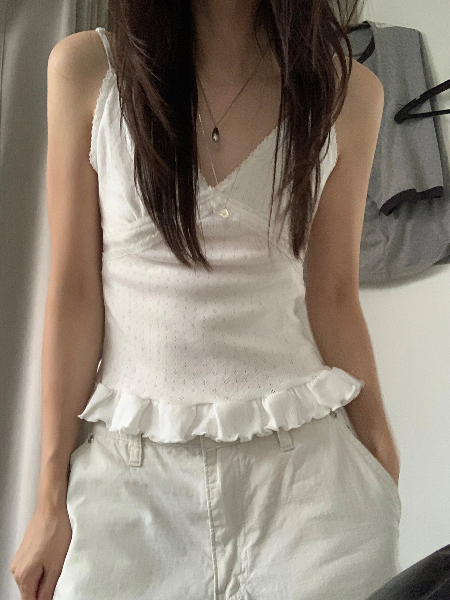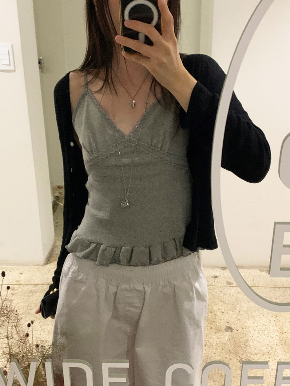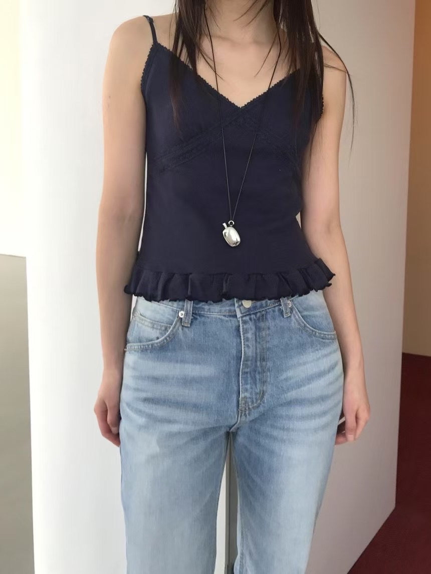 壓花蕾絲胸線細節荷葉邊背心