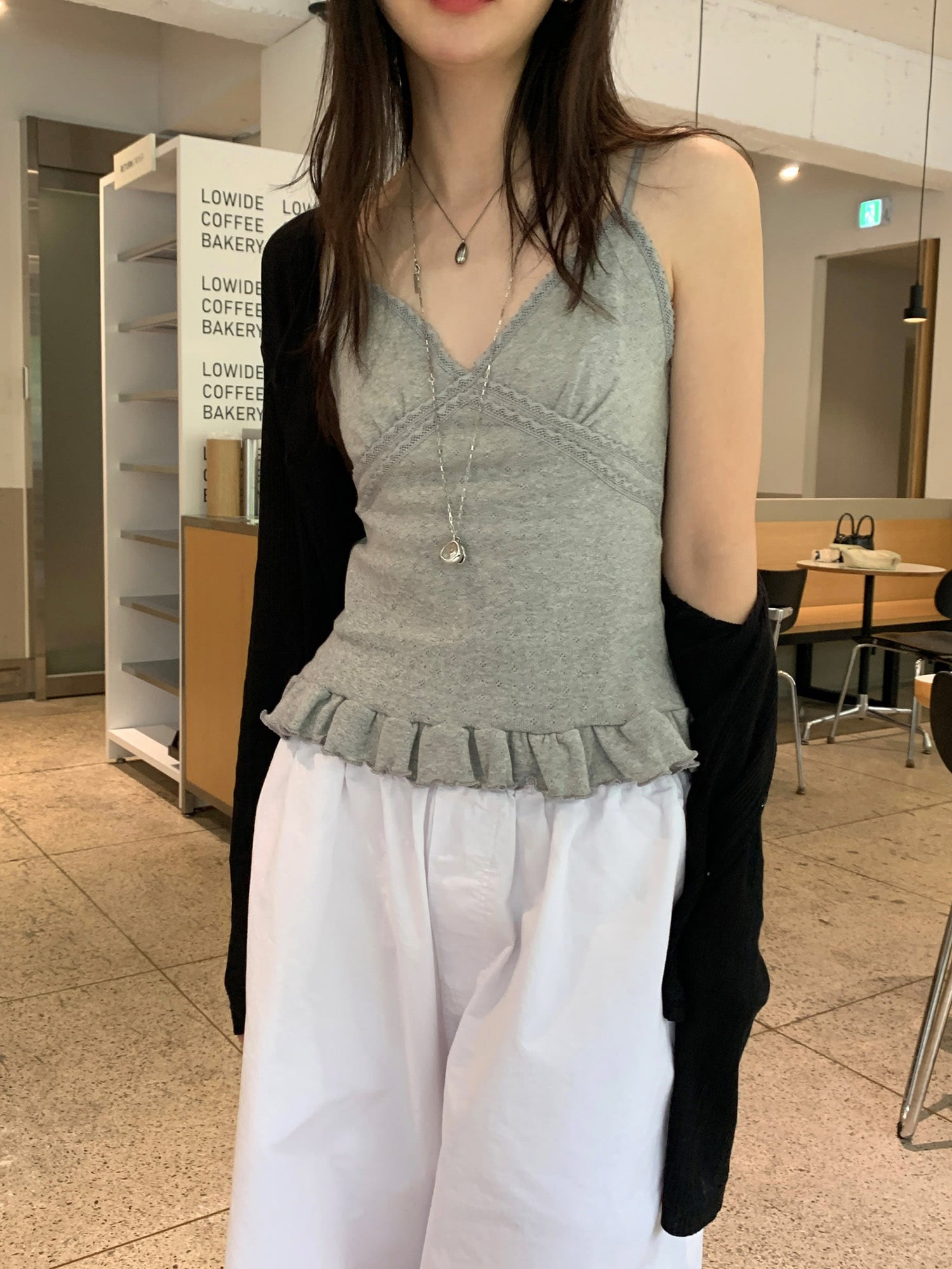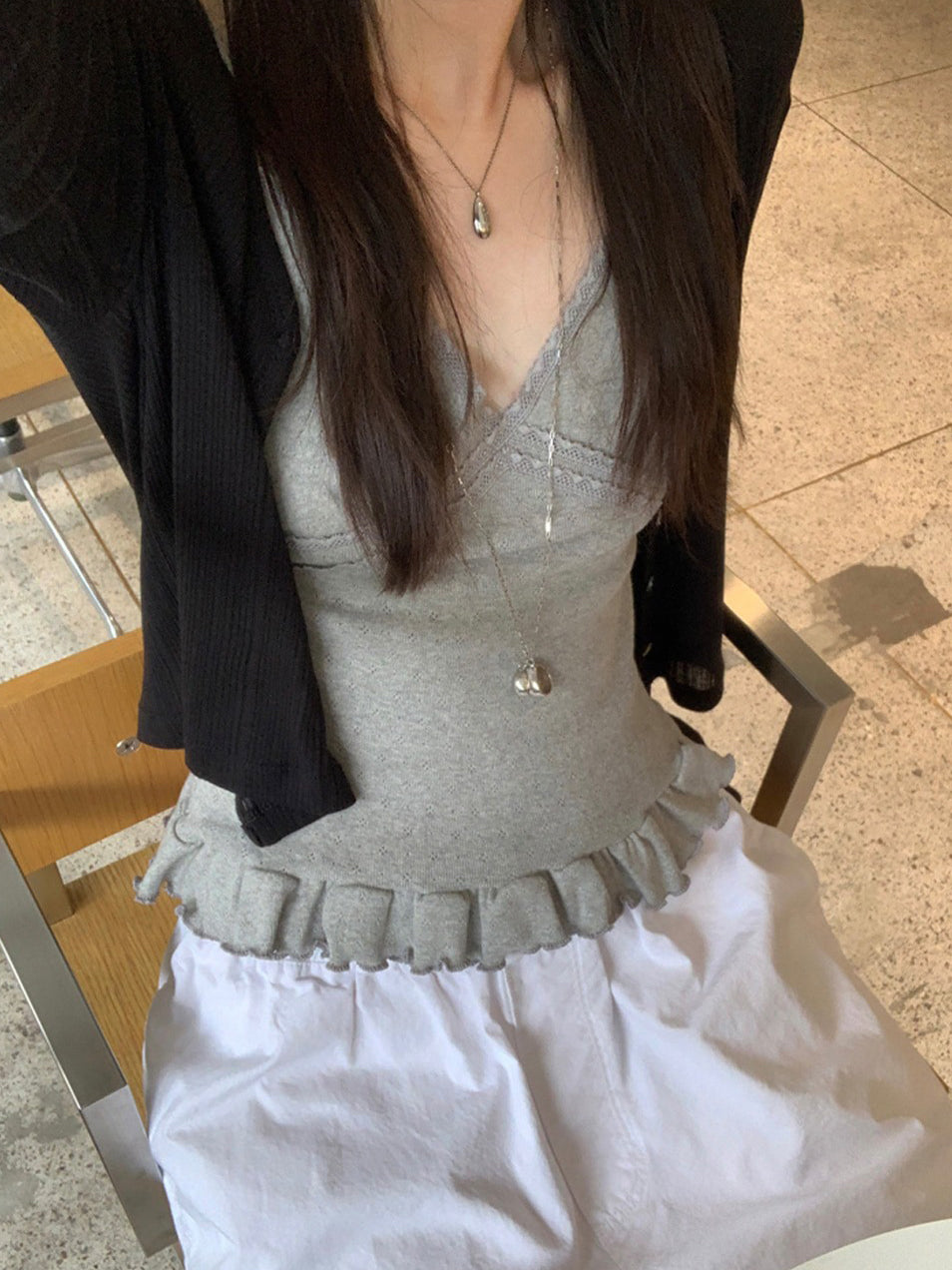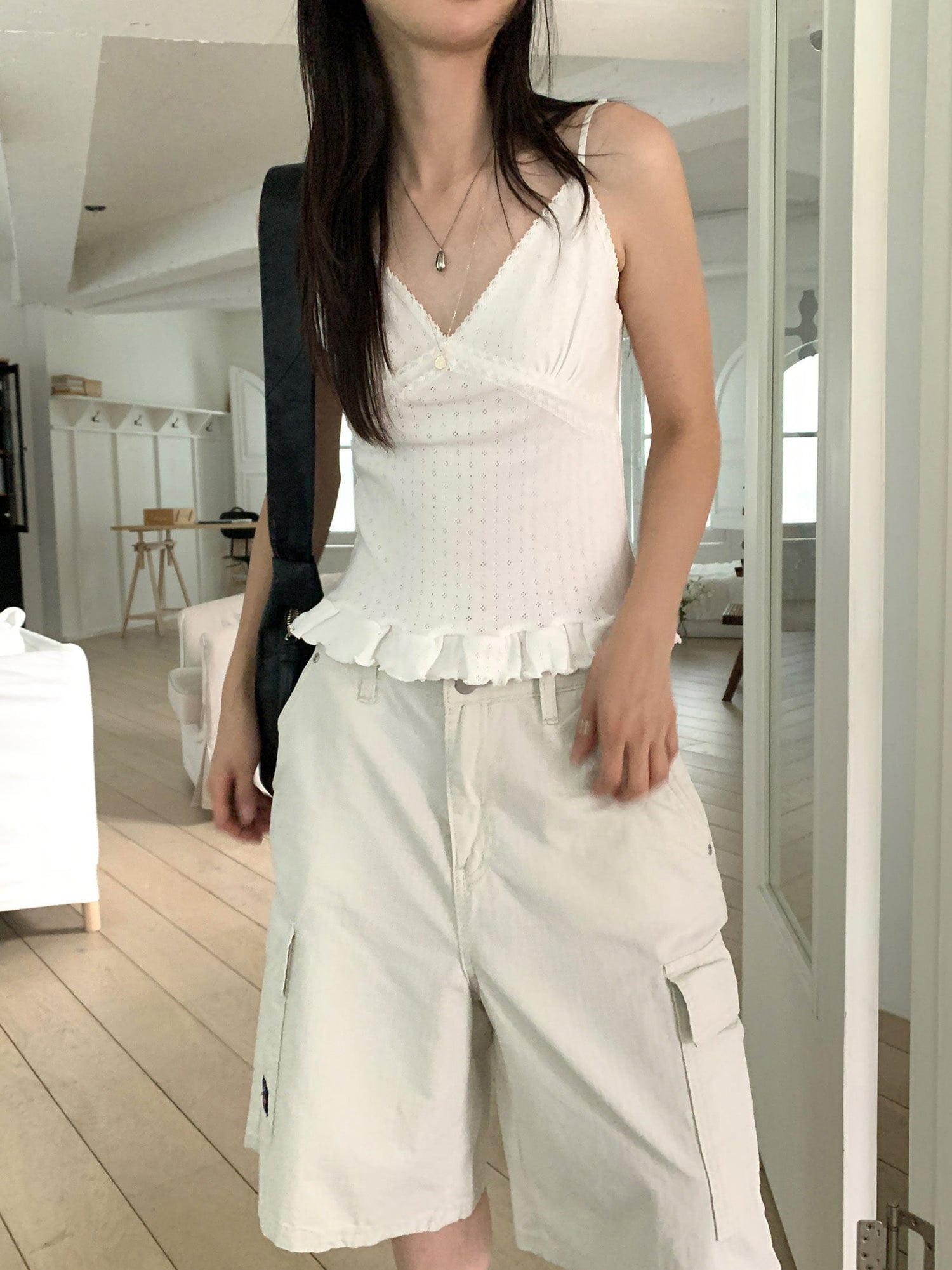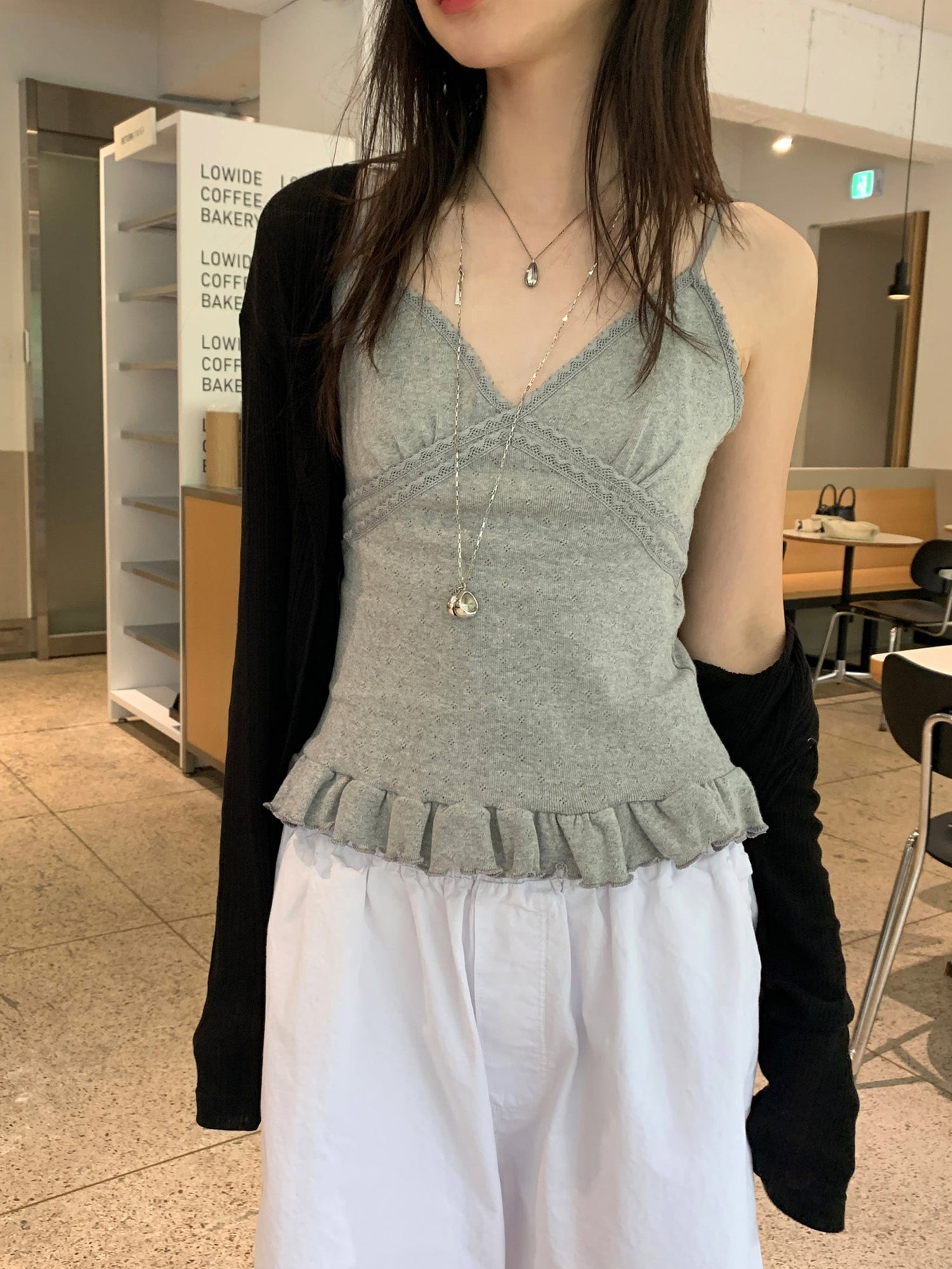 壓花蕾絲胸線細節荷葉邊背心