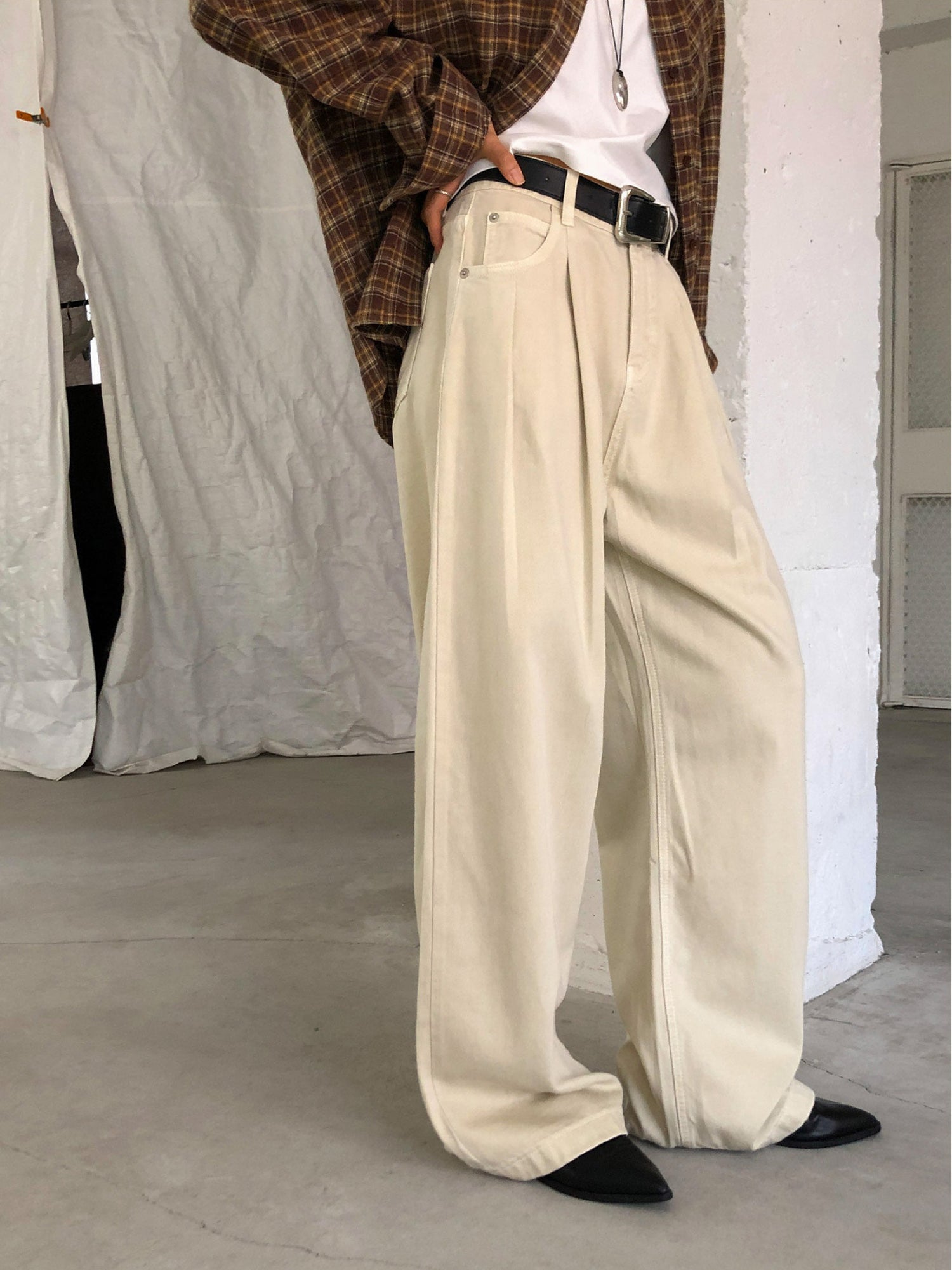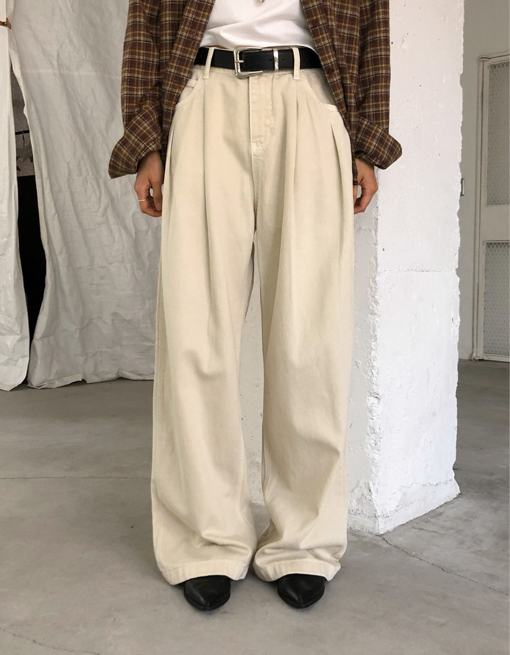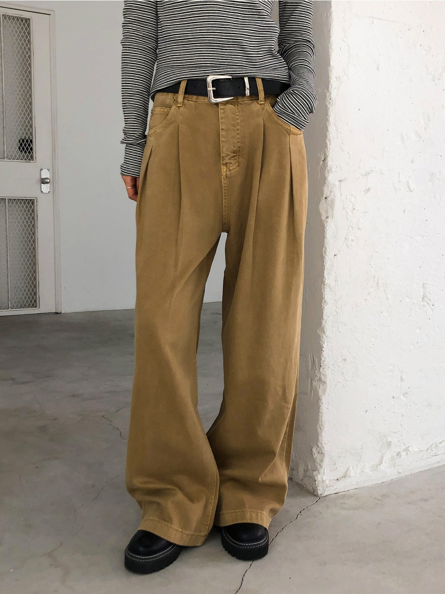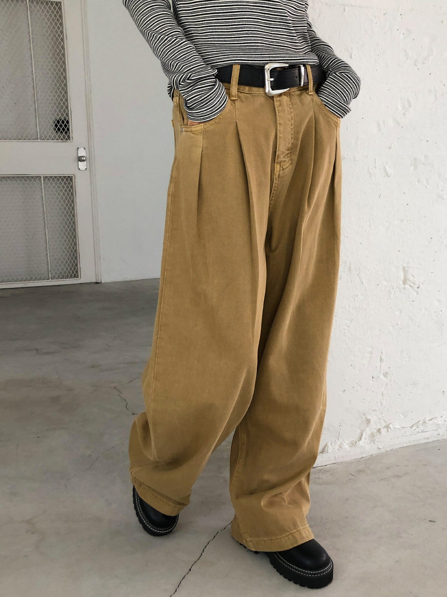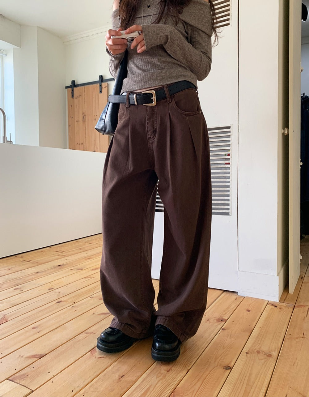 復古美色雙壓褶垂感闊褲(附皮帶)