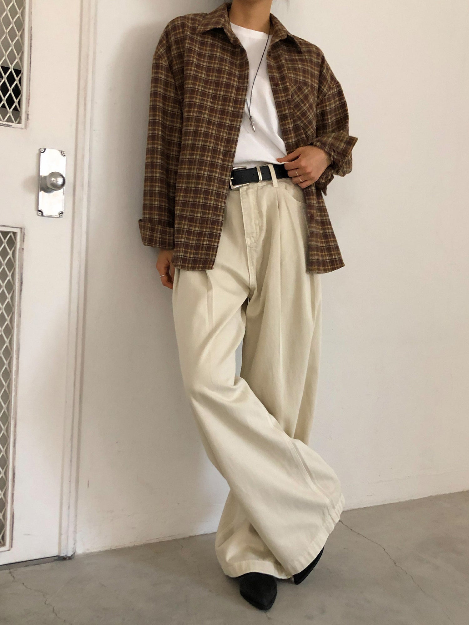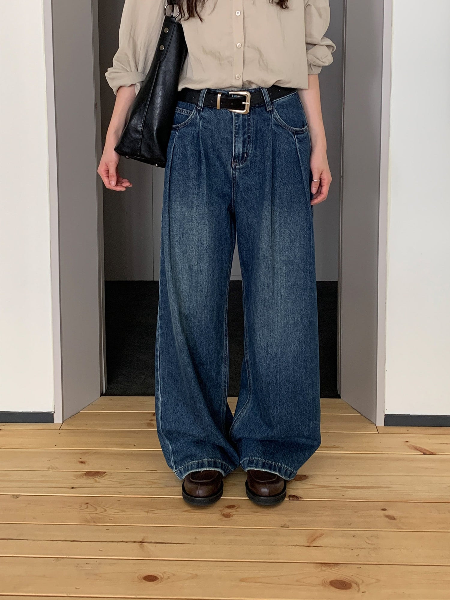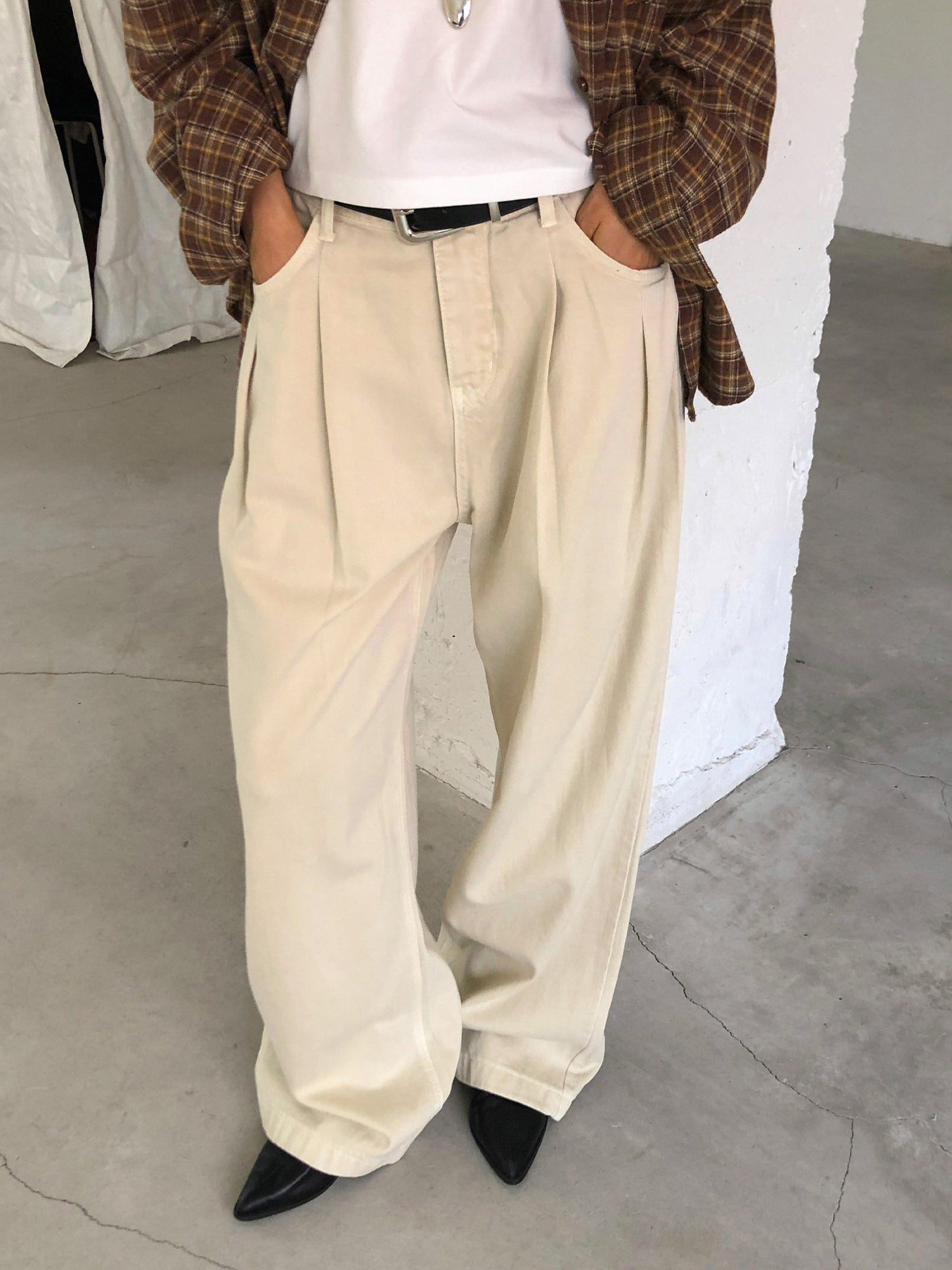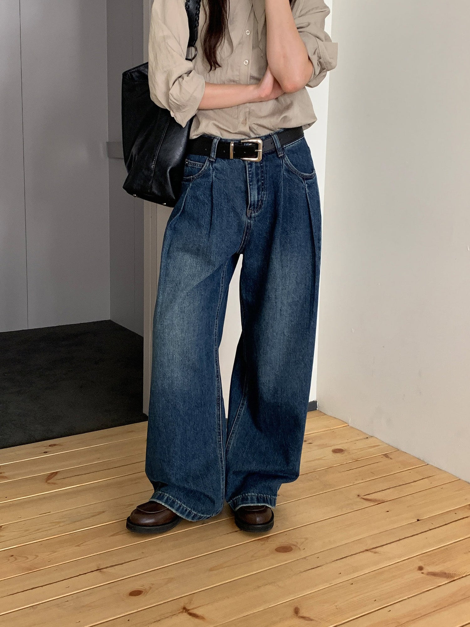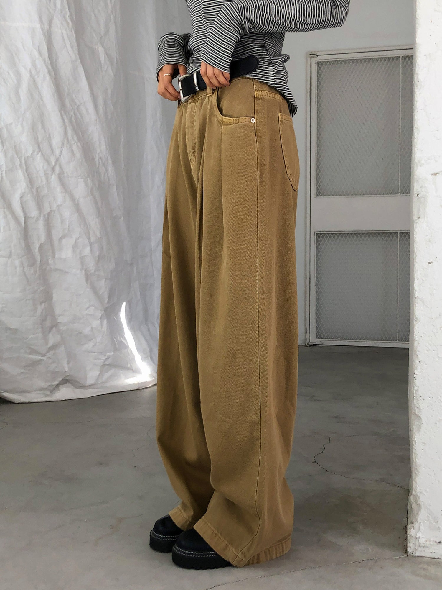 復古美色雙壓褶垂感闊褲(附皮帶)