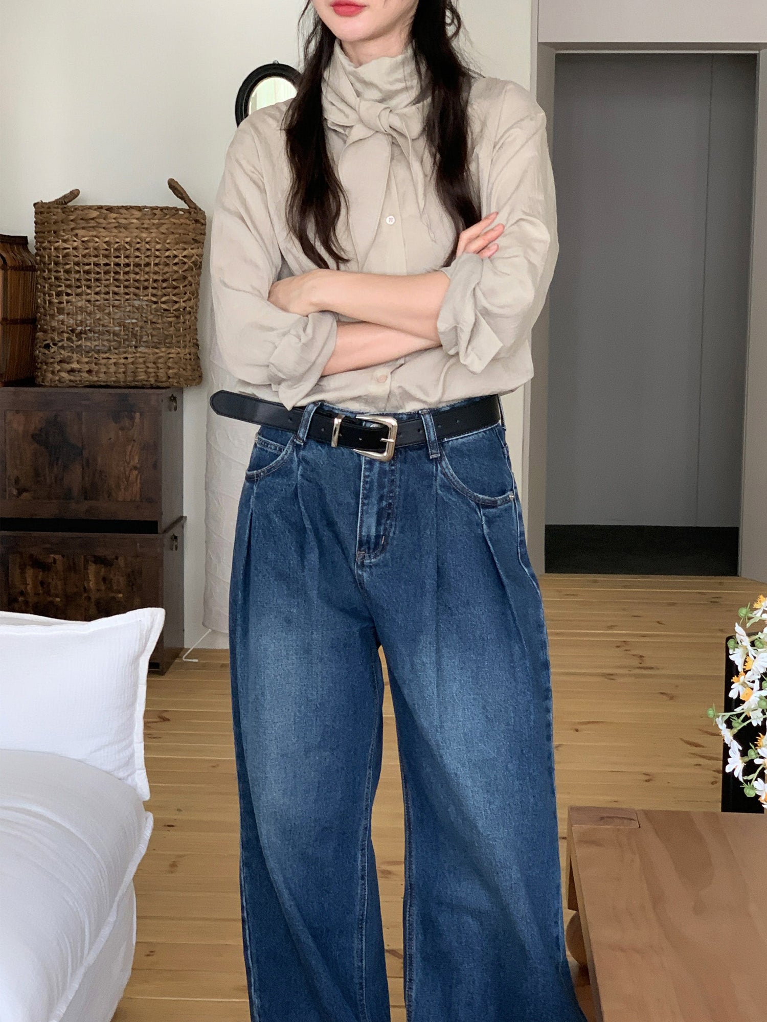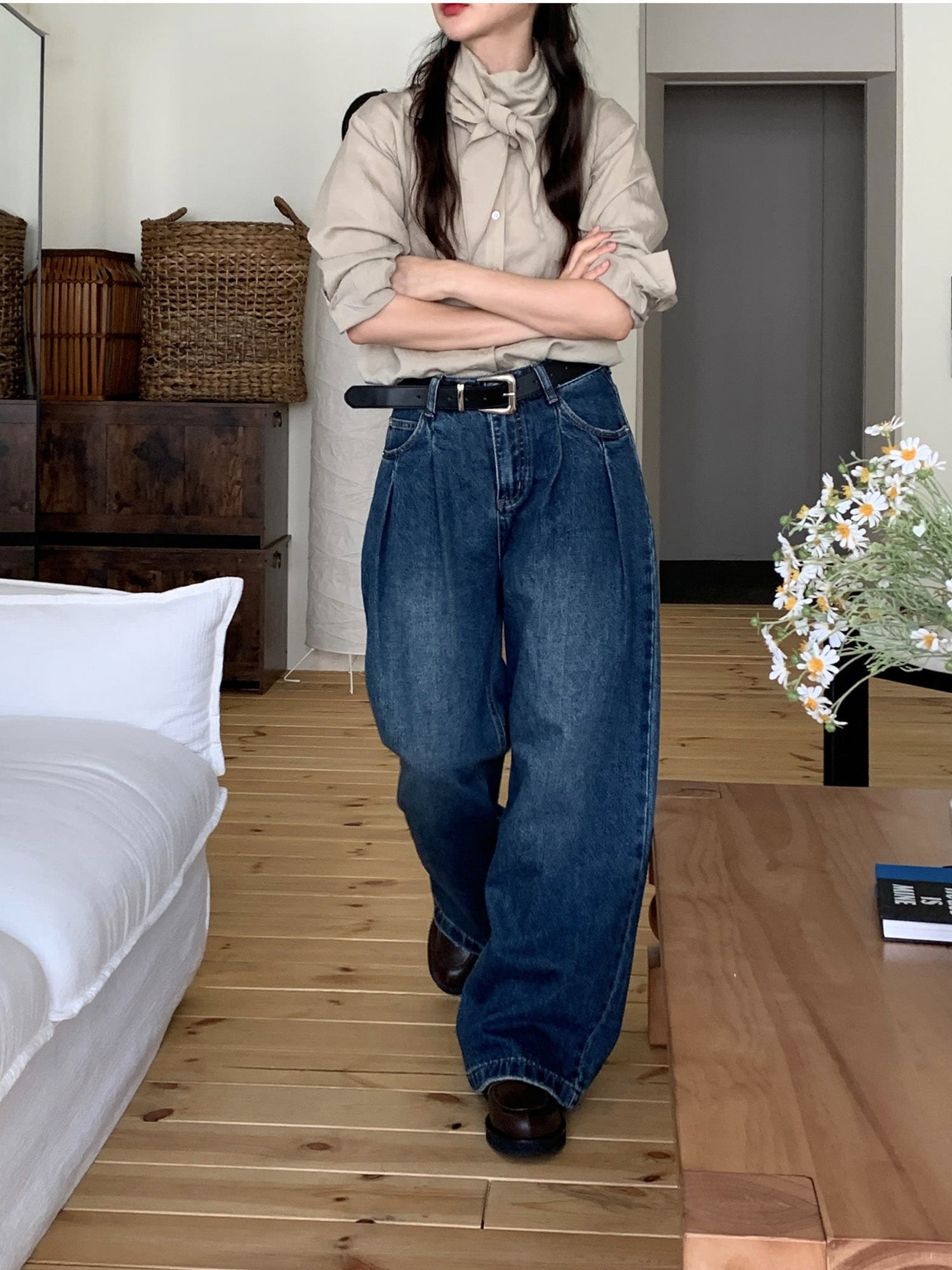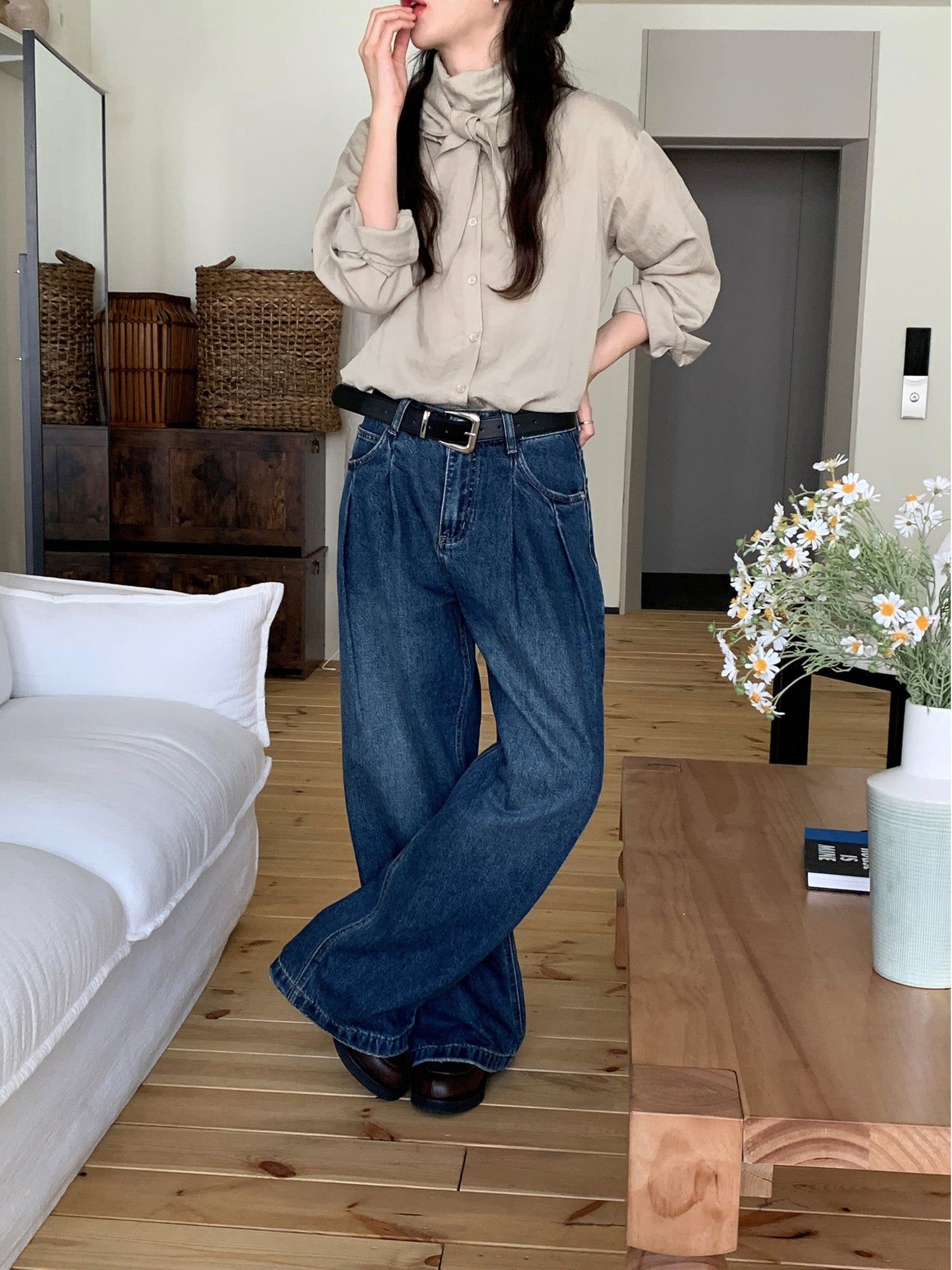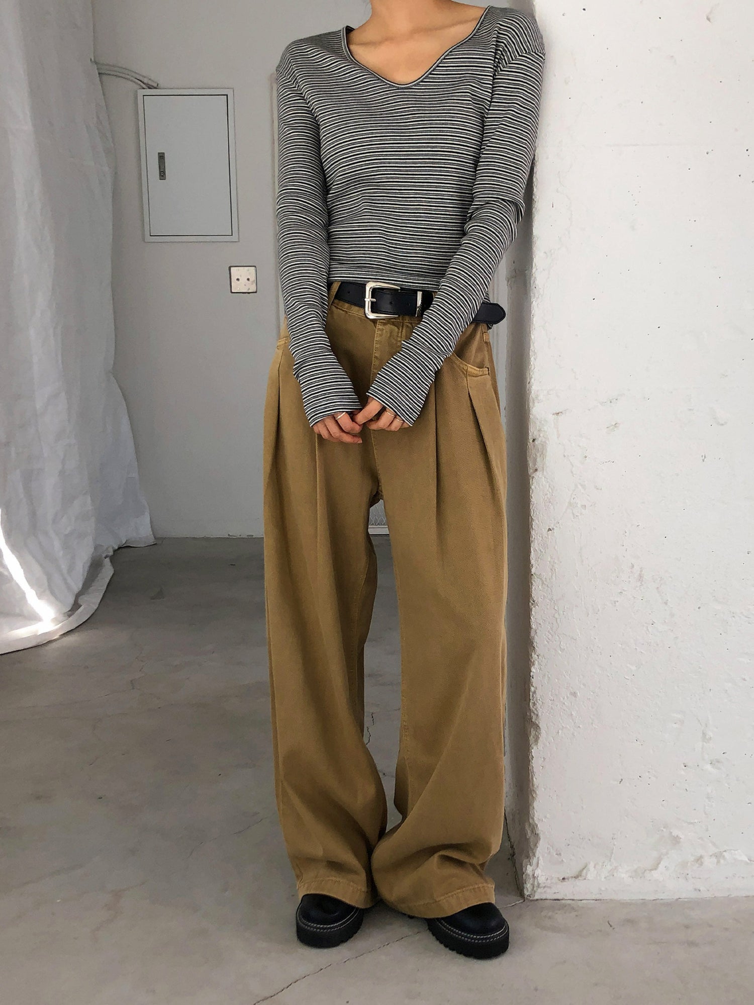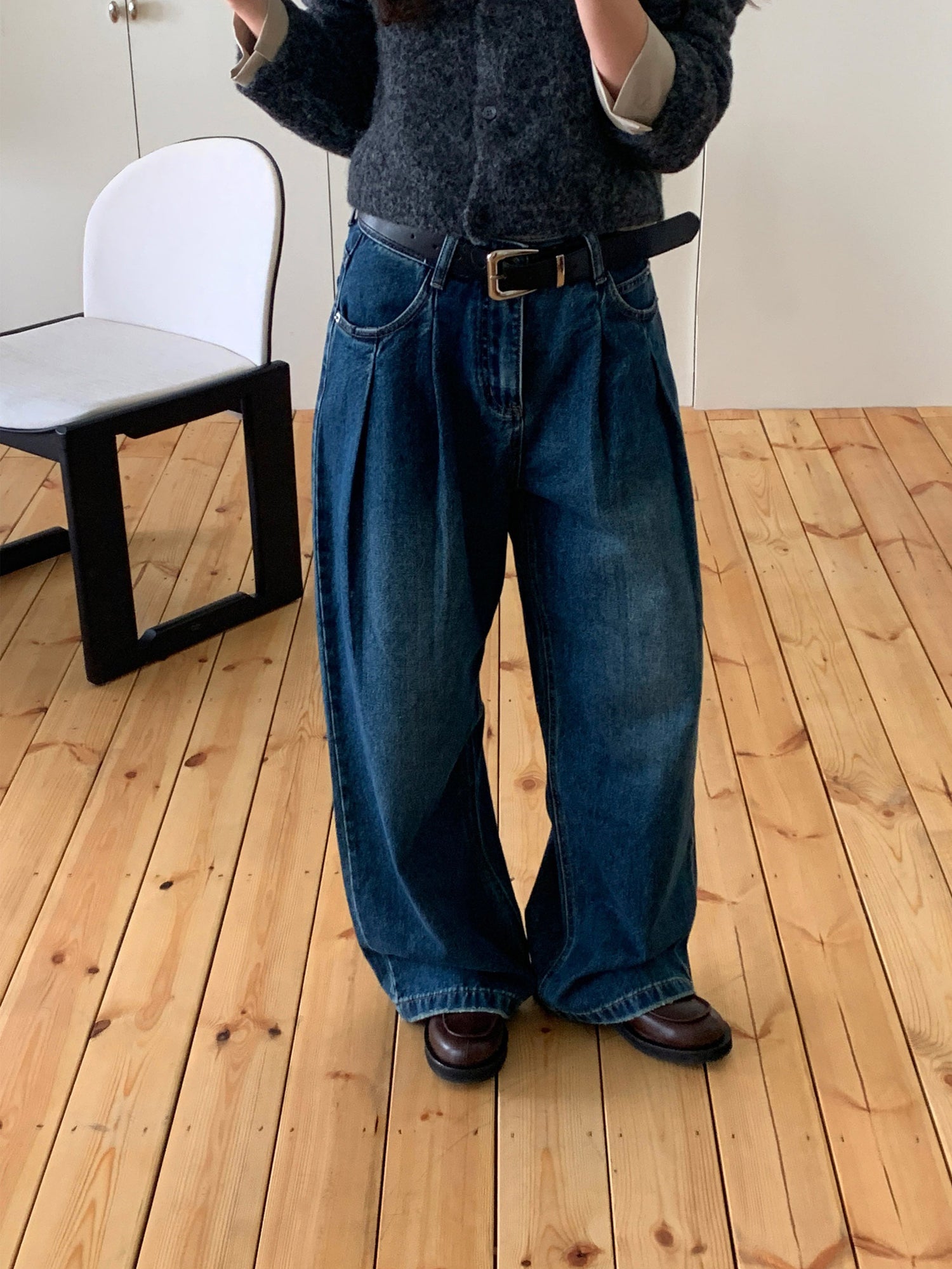 復古美色雙壓褶垂感闊褲(附皮帶)