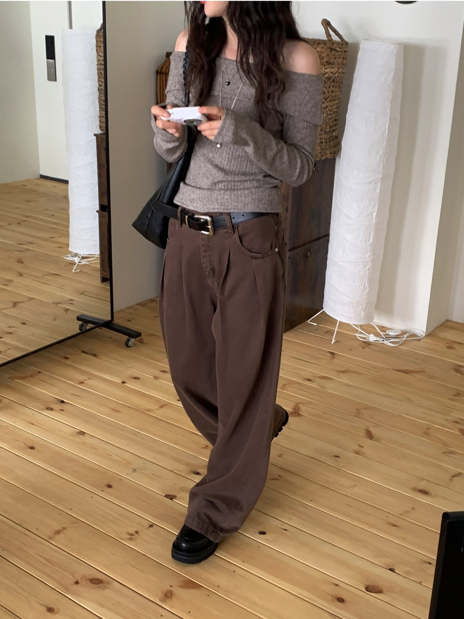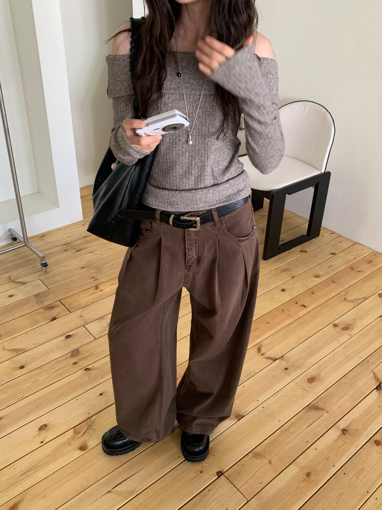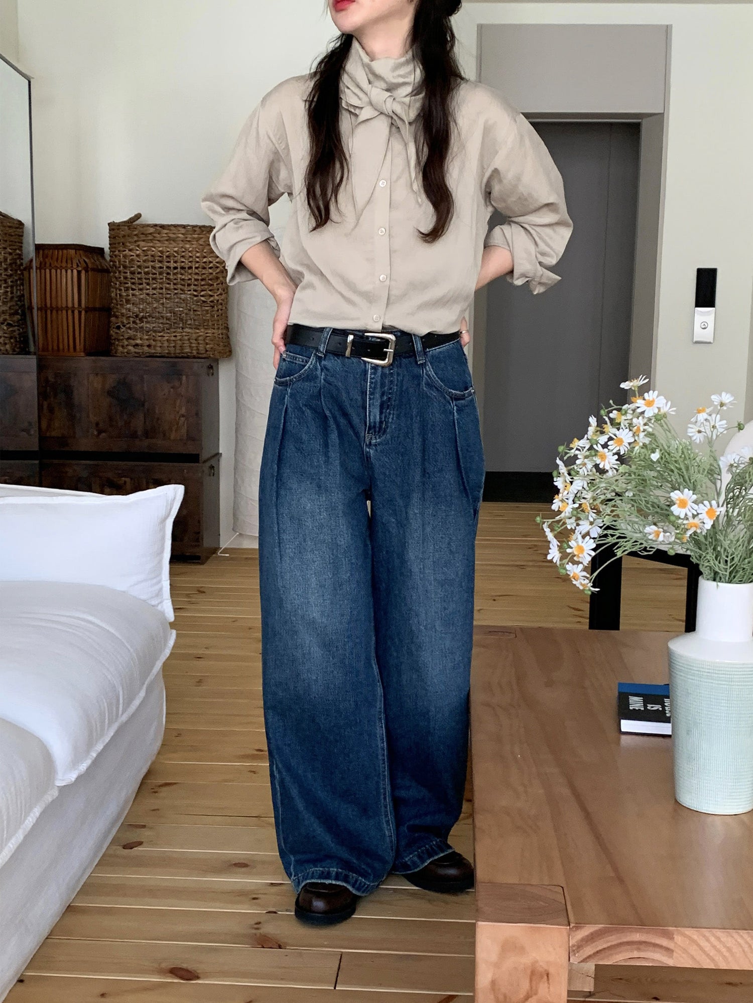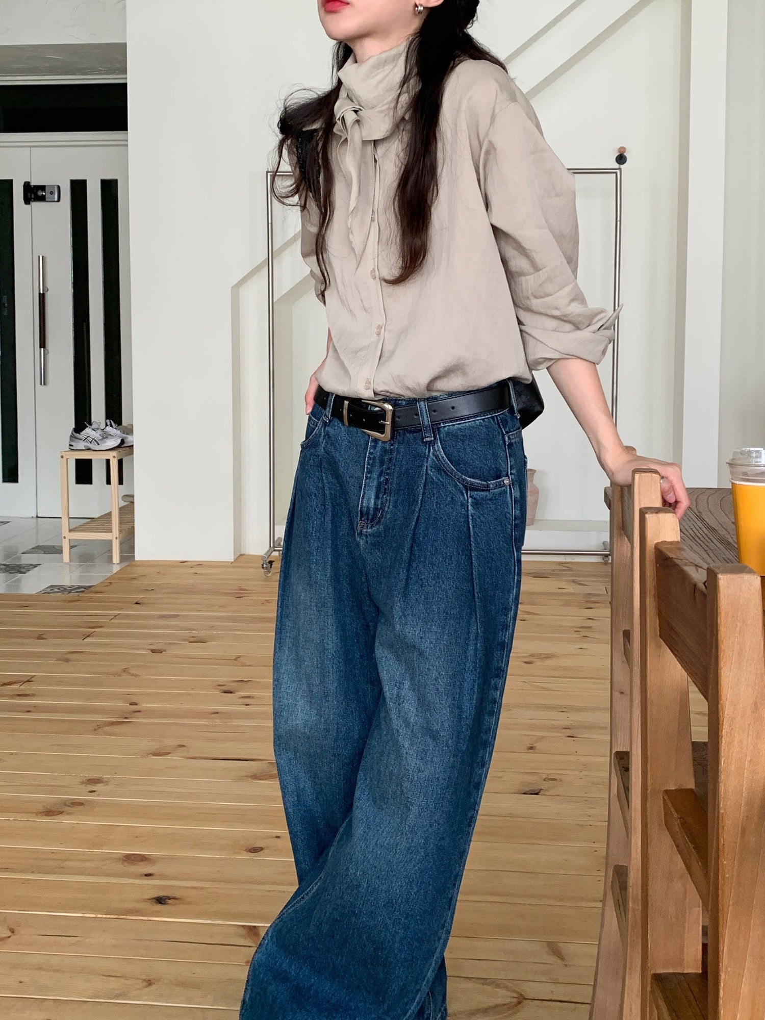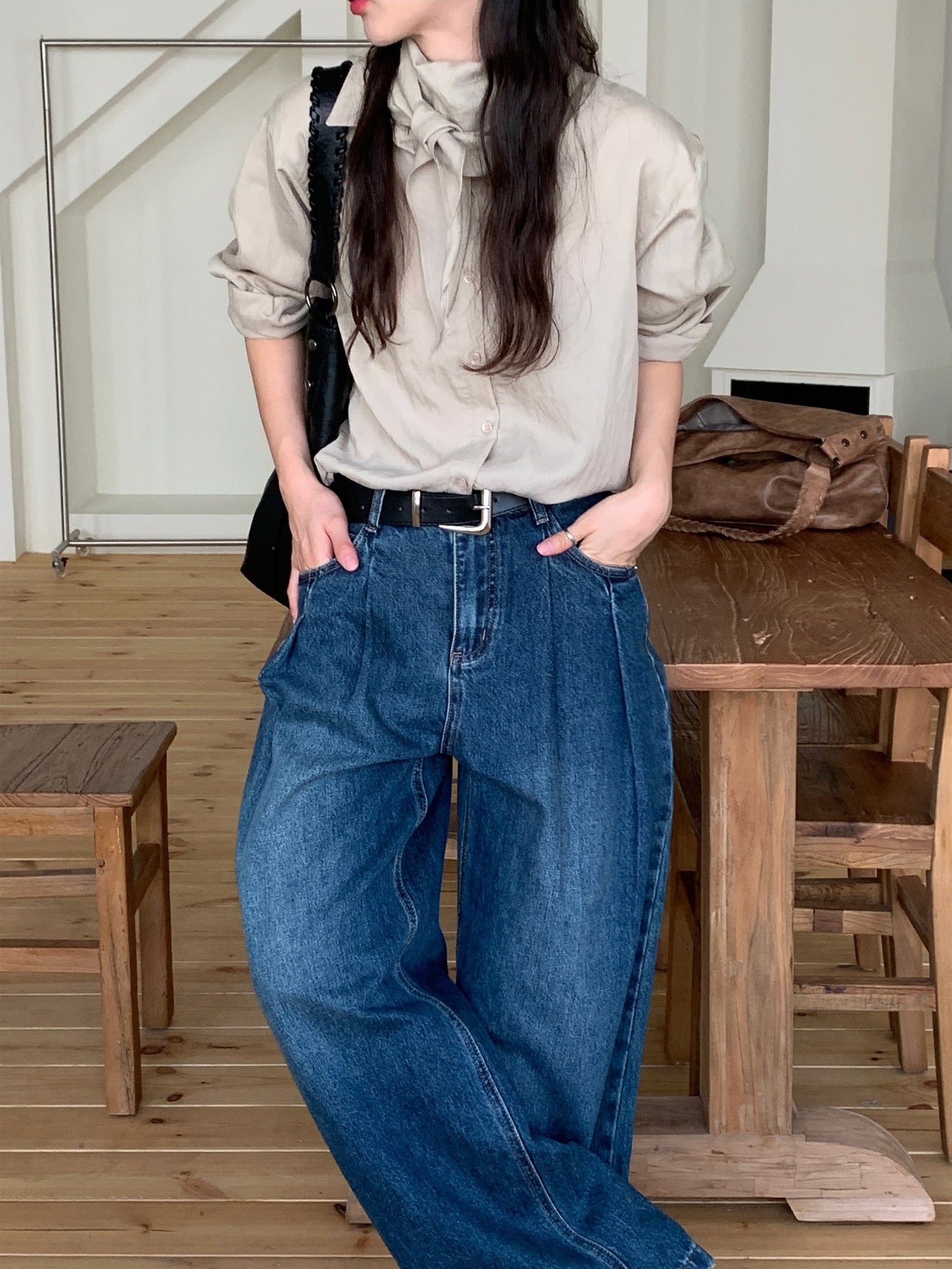 復古美色雙壓褶垂感闊褲(附皮帶)