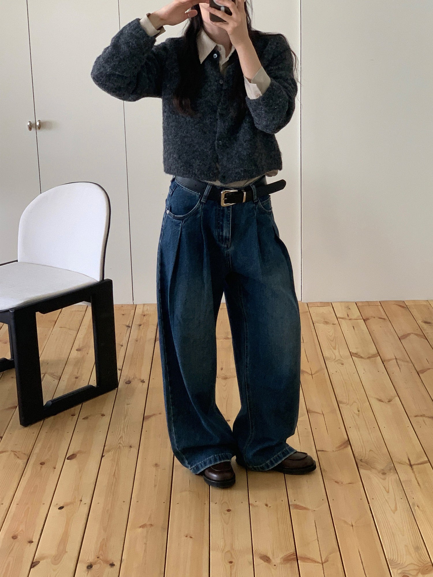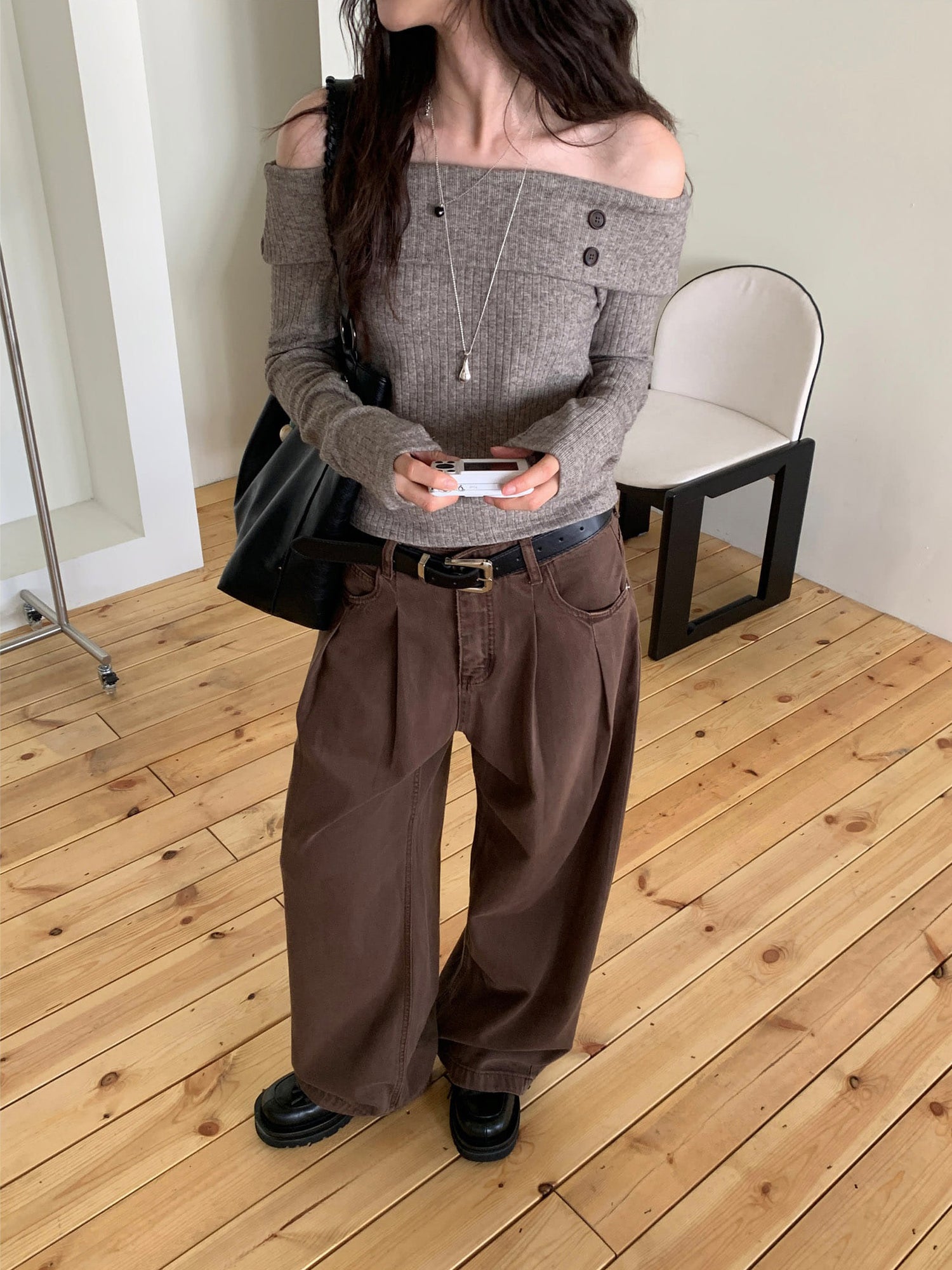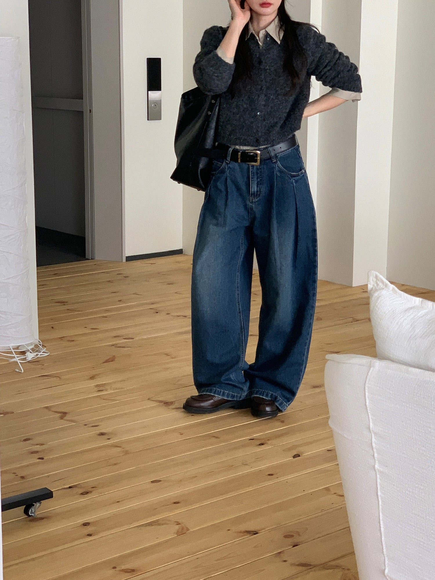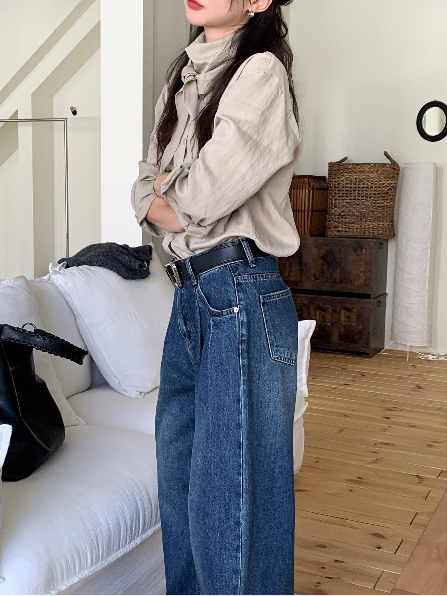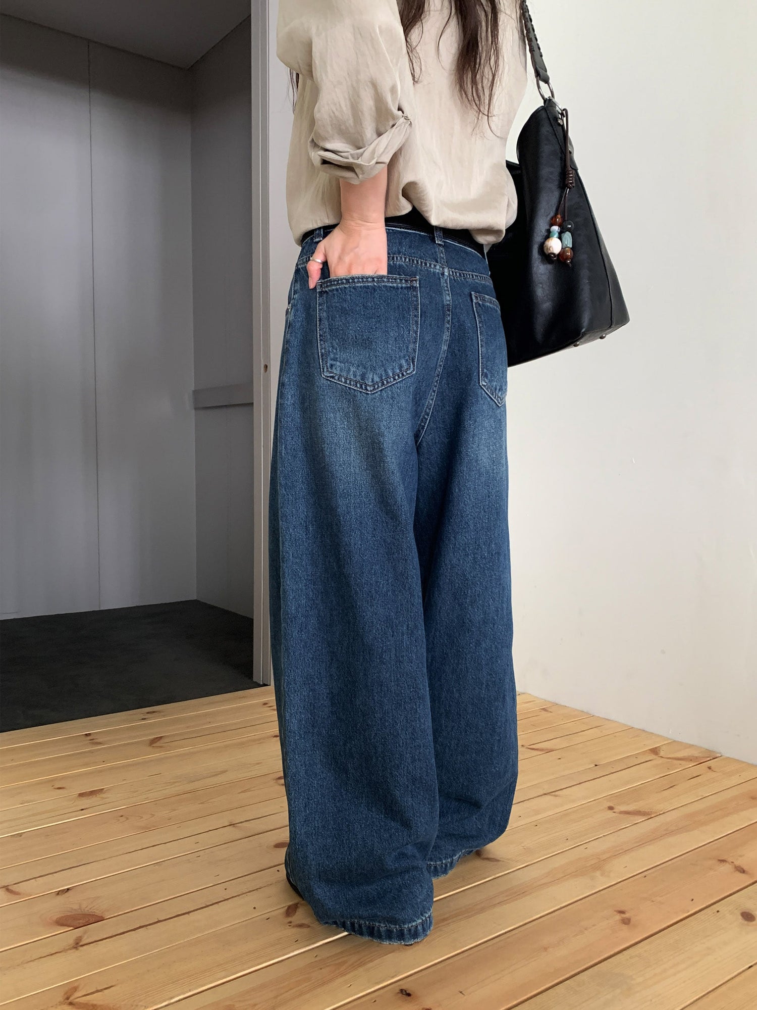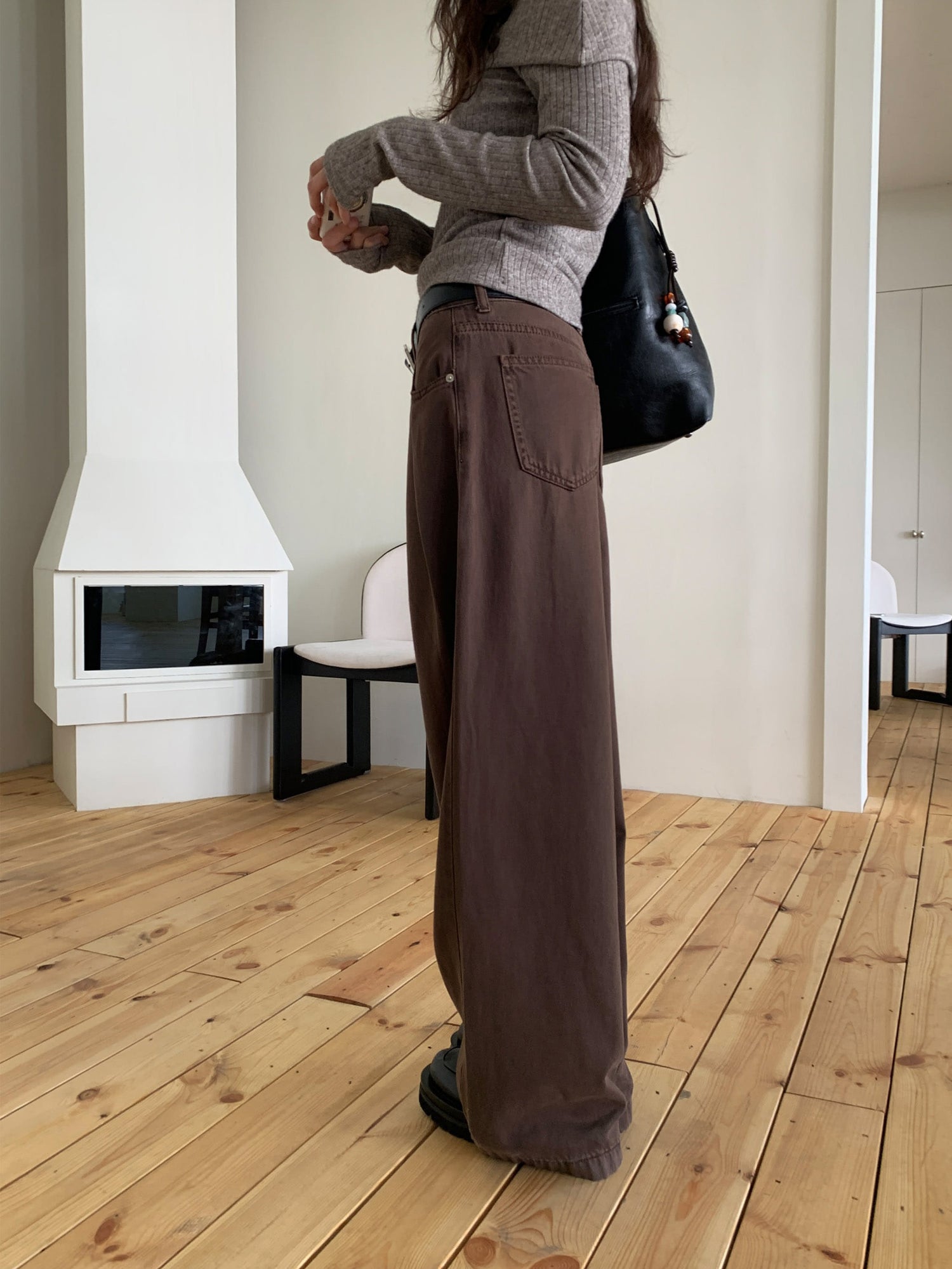 復古美色雙壓褶垂感闊褲(附皮帶)
