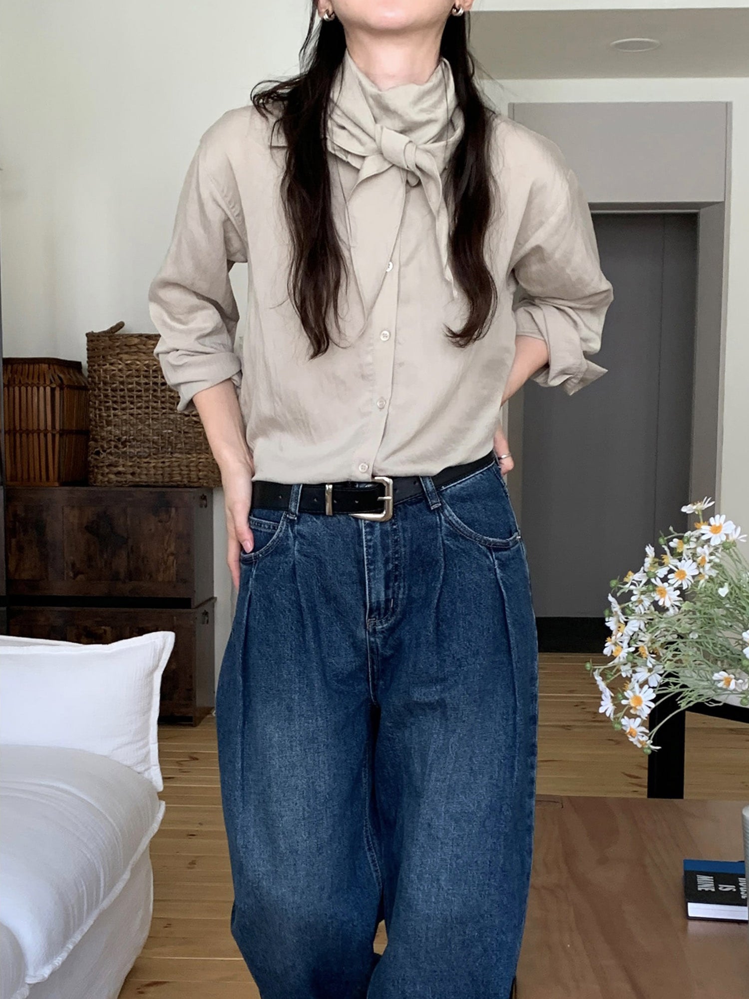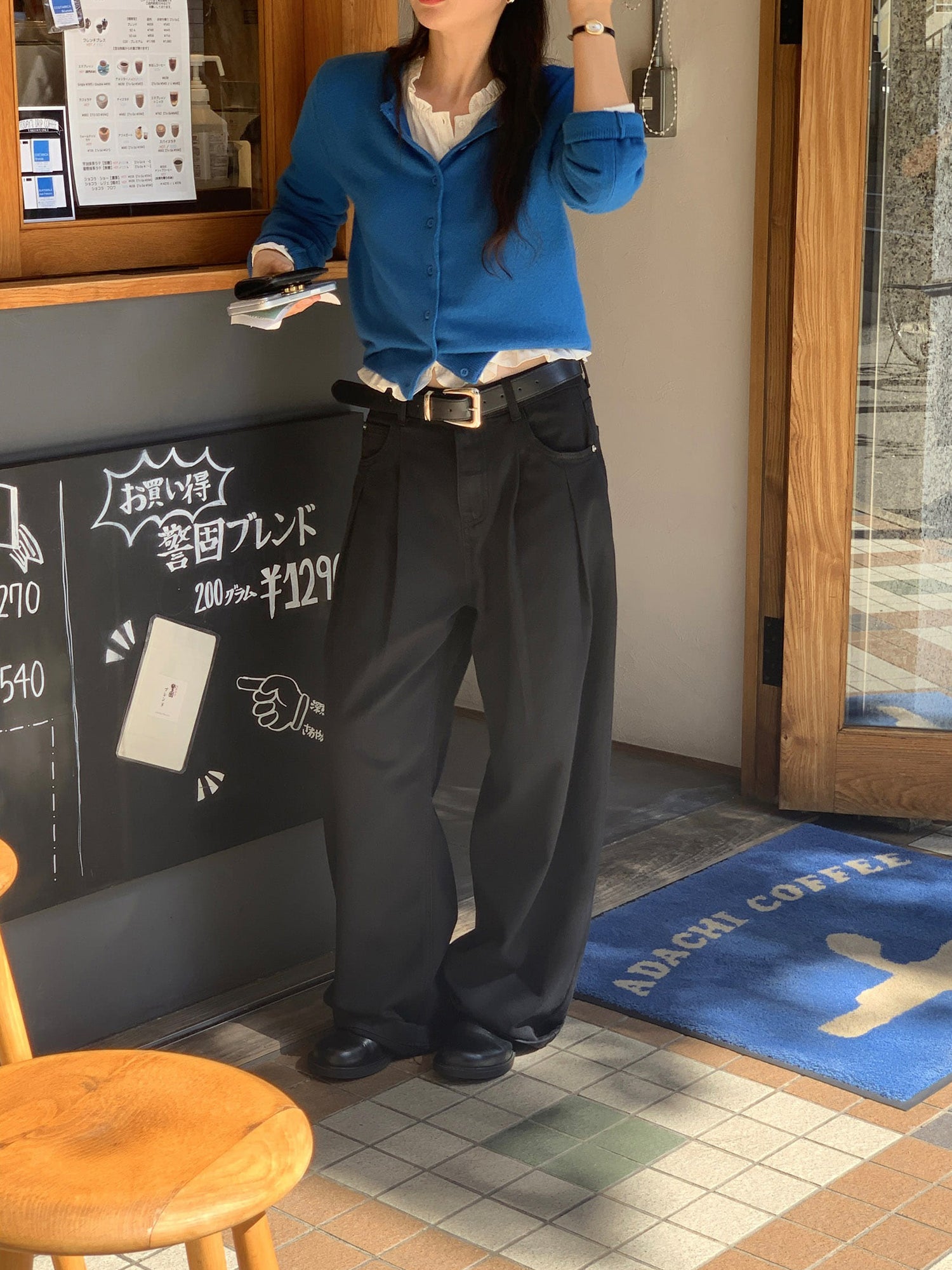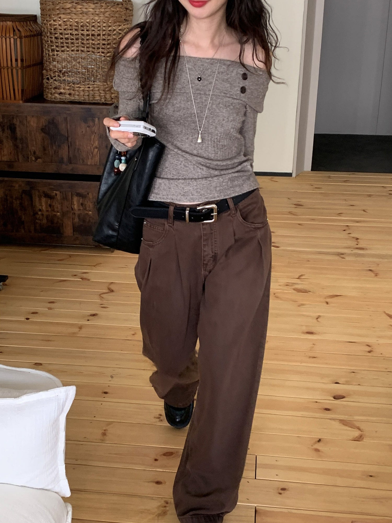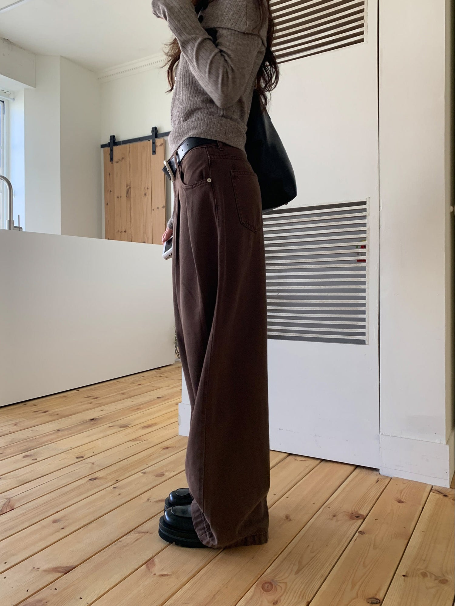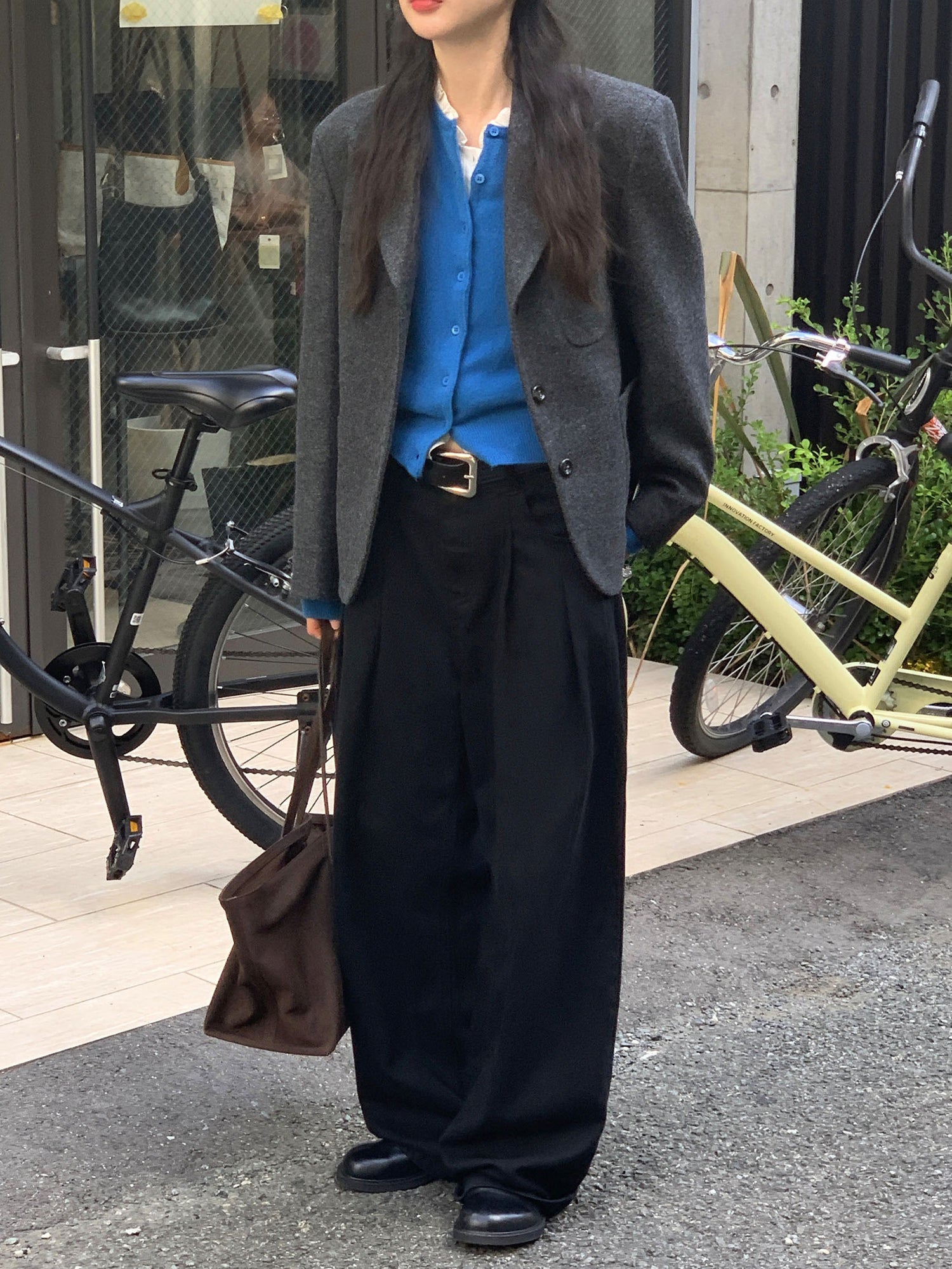復古美色雙壓褶垂感闊褲(附皮帶)