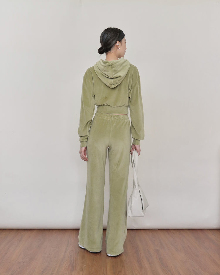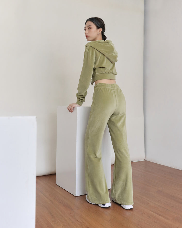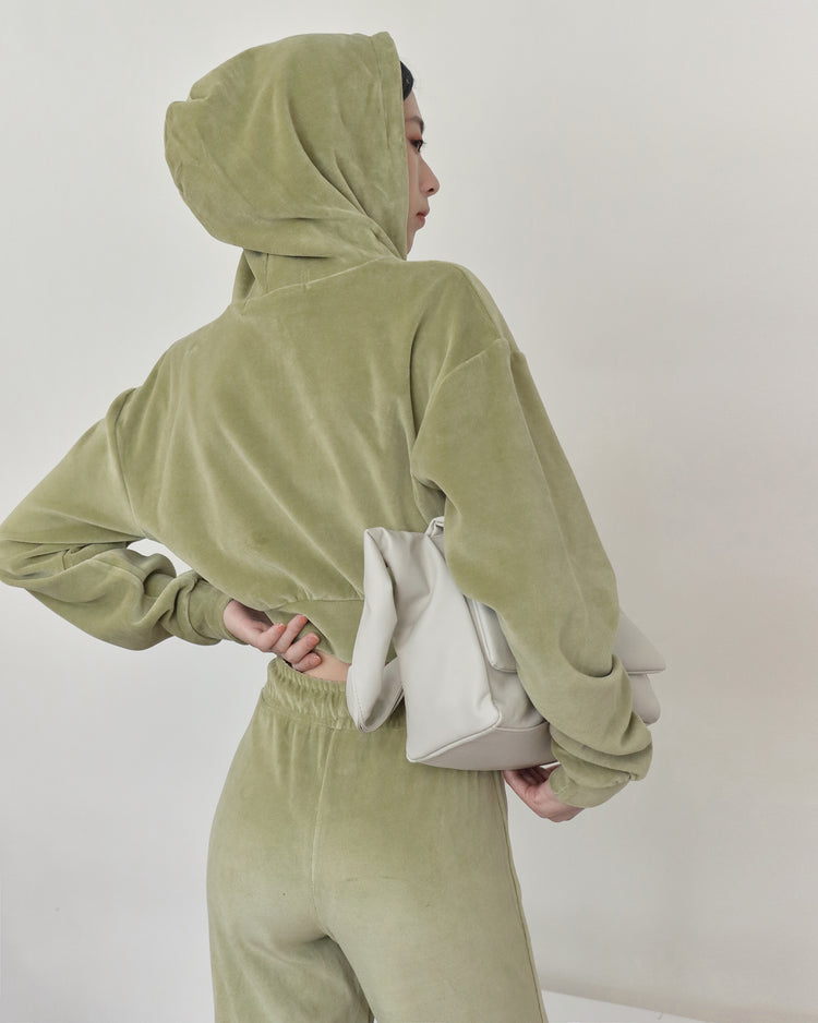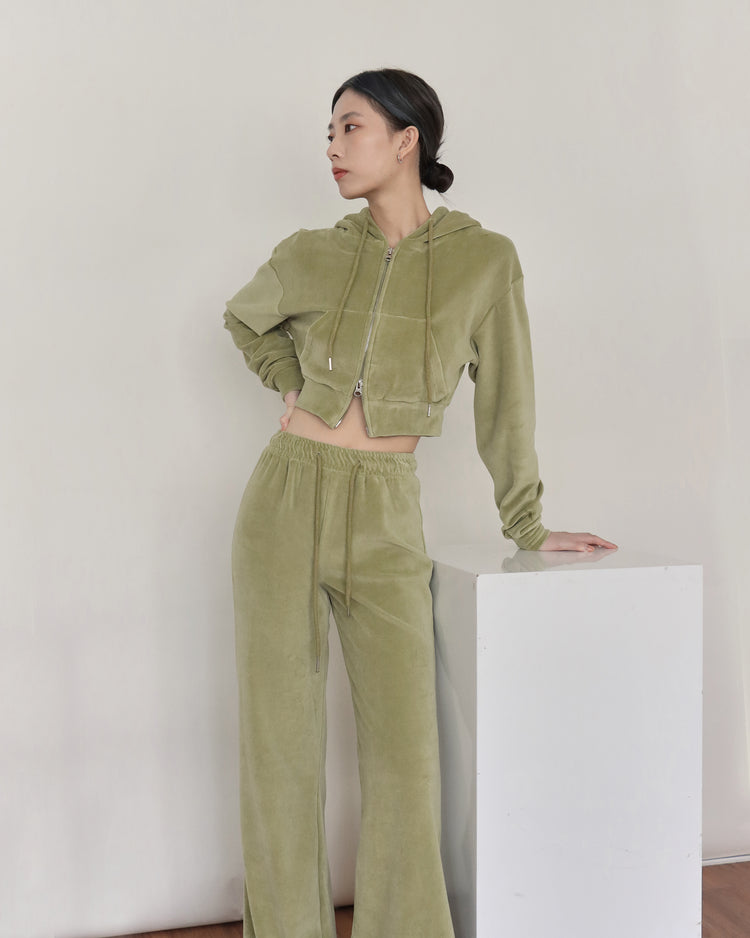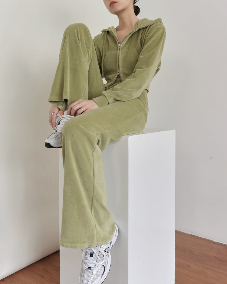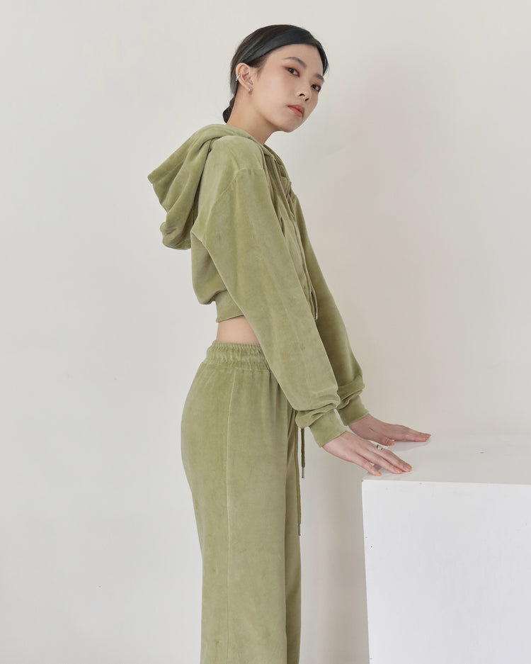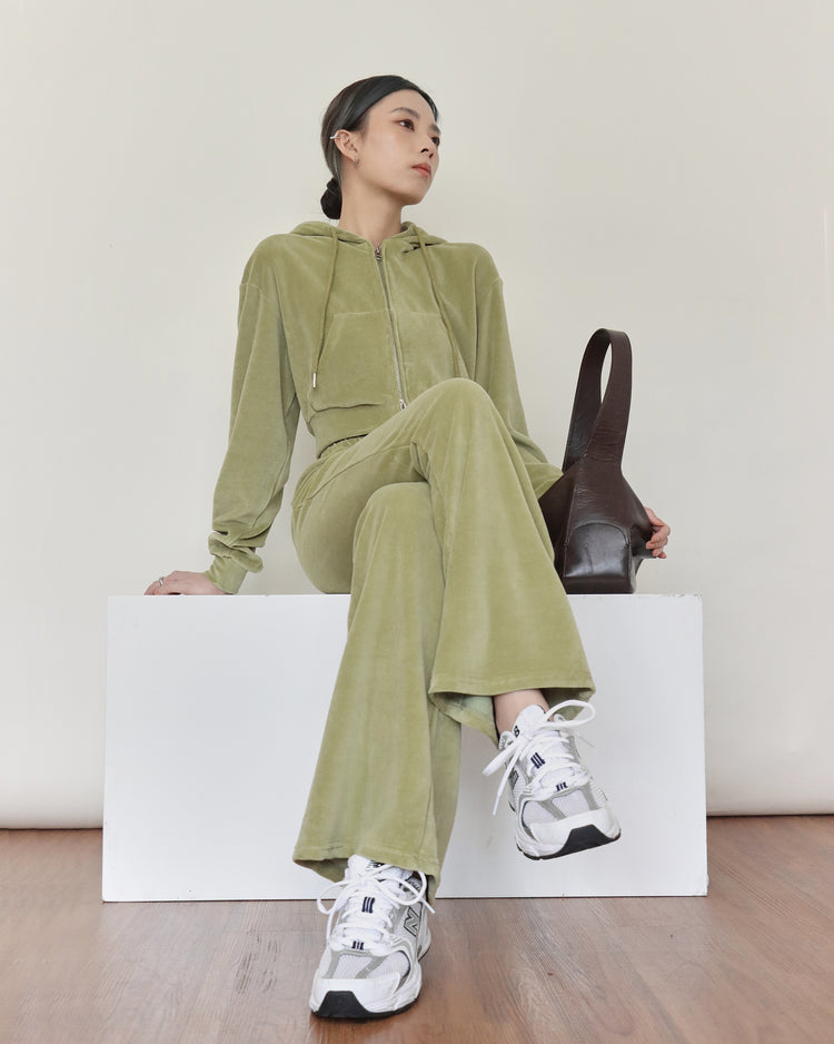 (Fitting)絨面連帽修身休閒套裝-草綠