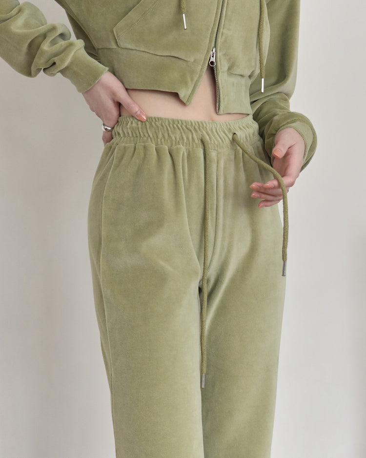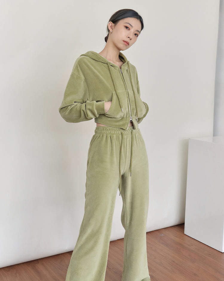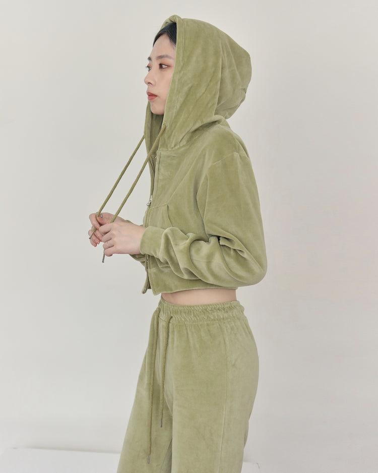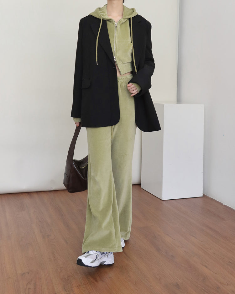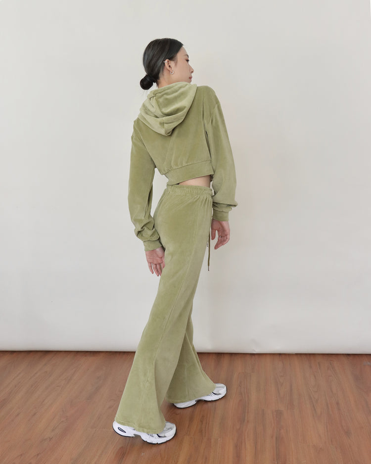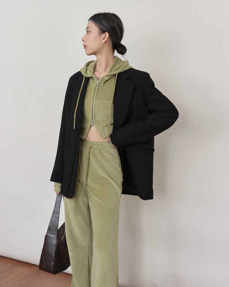 (Fitting)絨面連帽修身休閒套裝-草綠