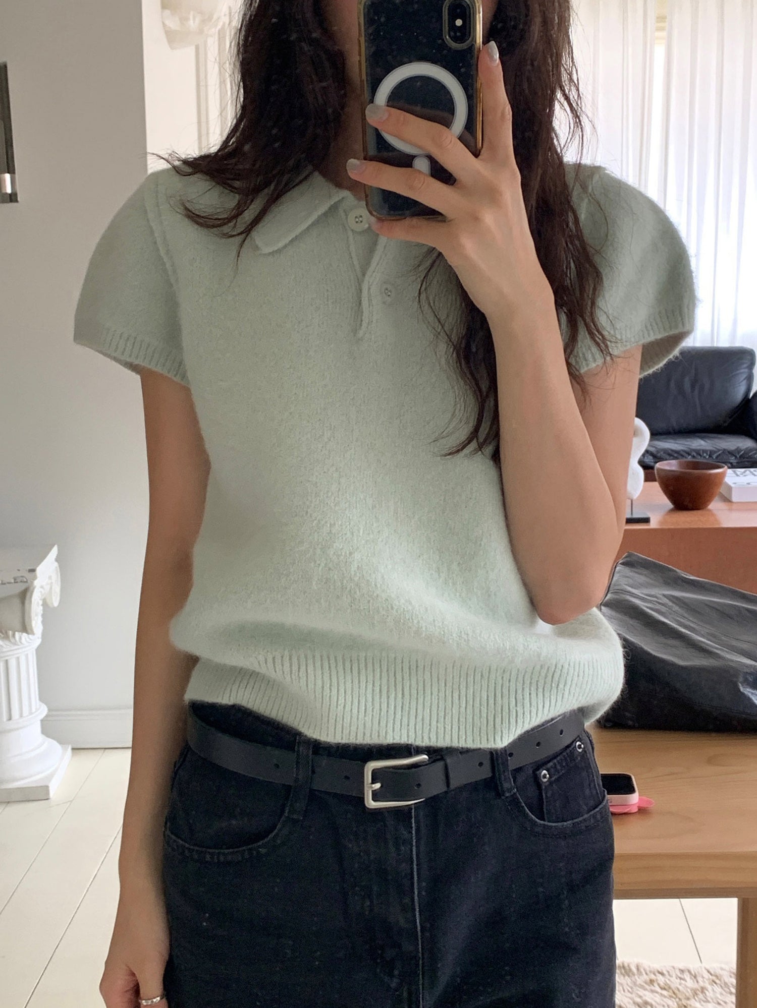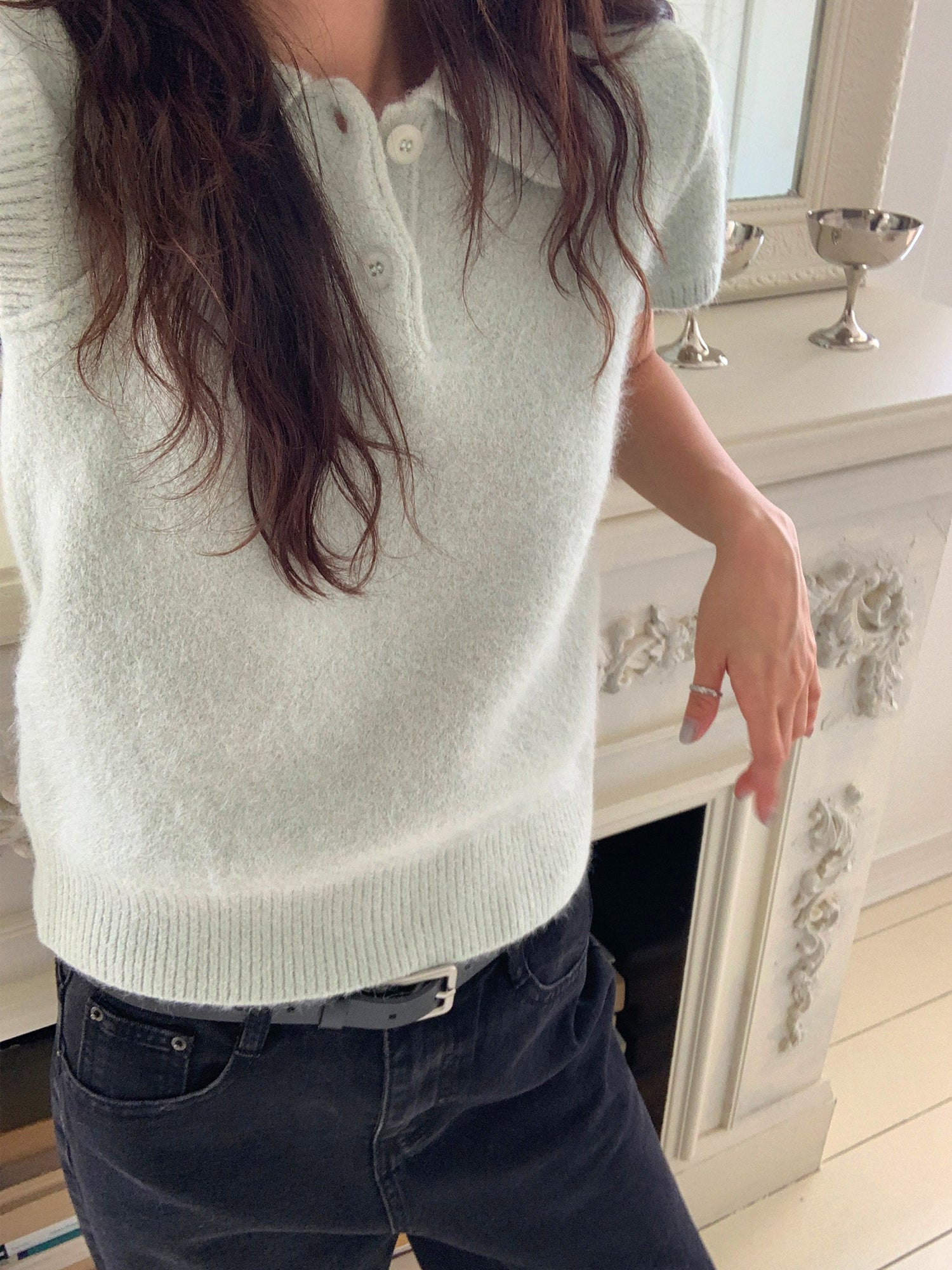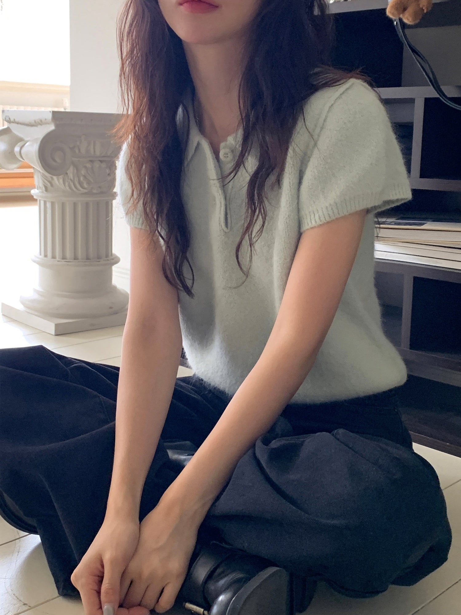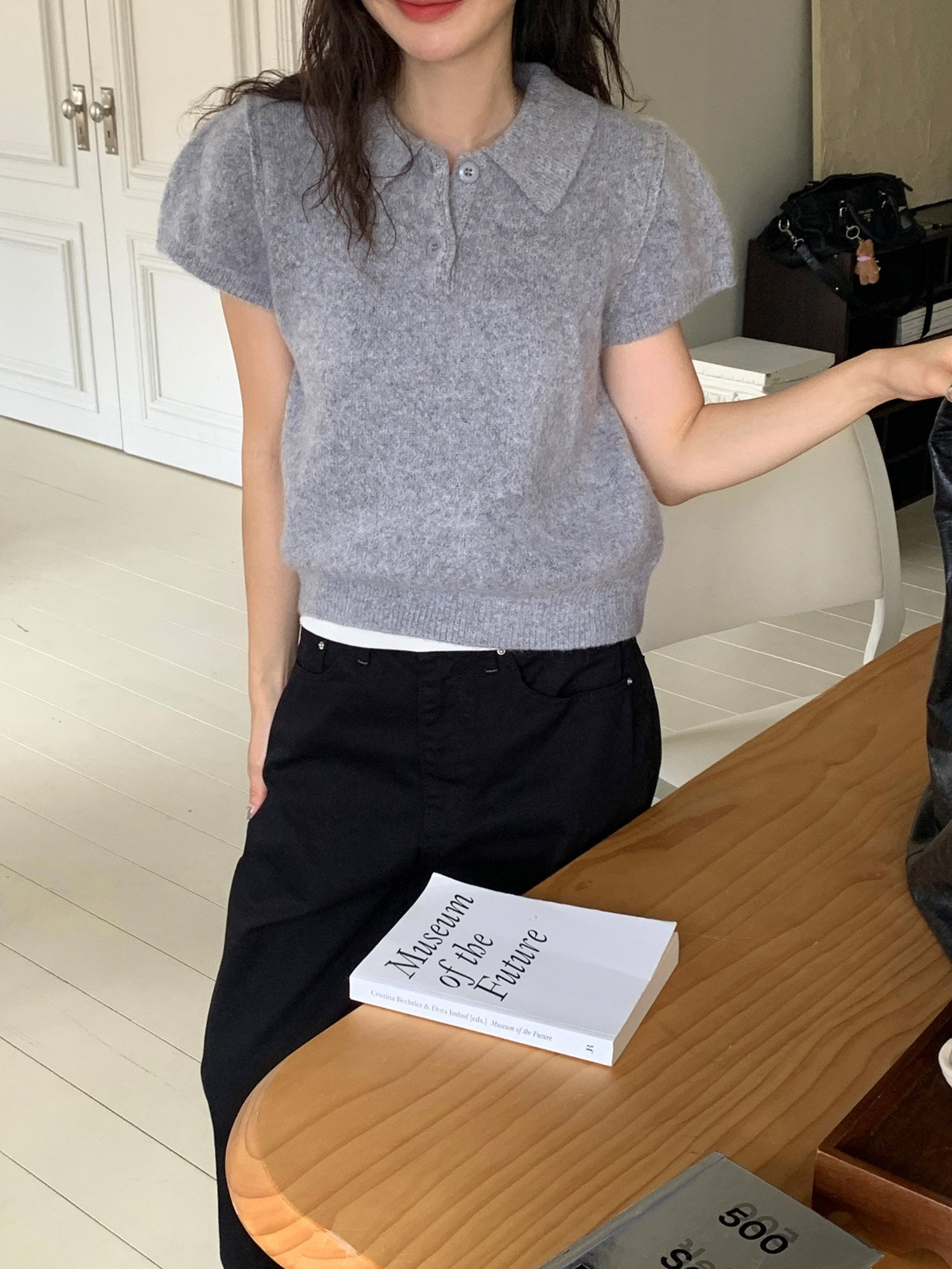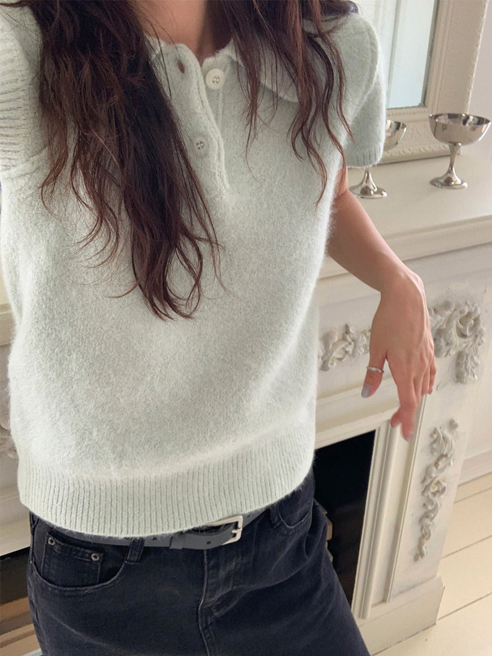 翻領扣鈕泡泡袖細節針織上衣