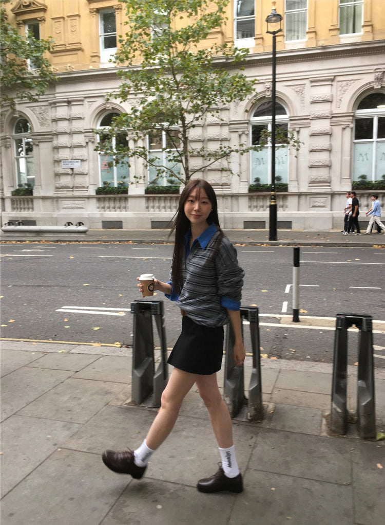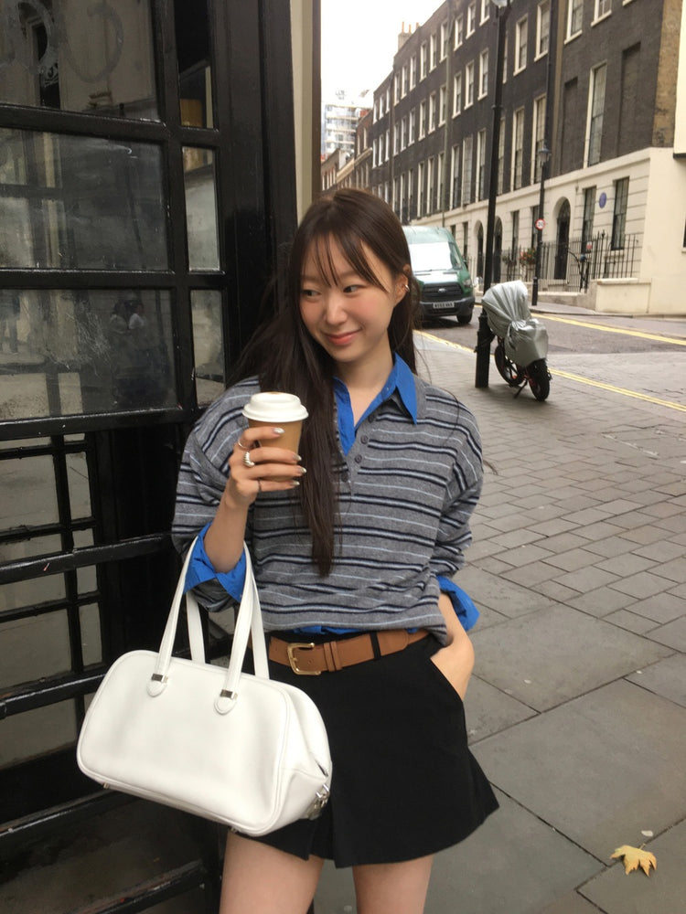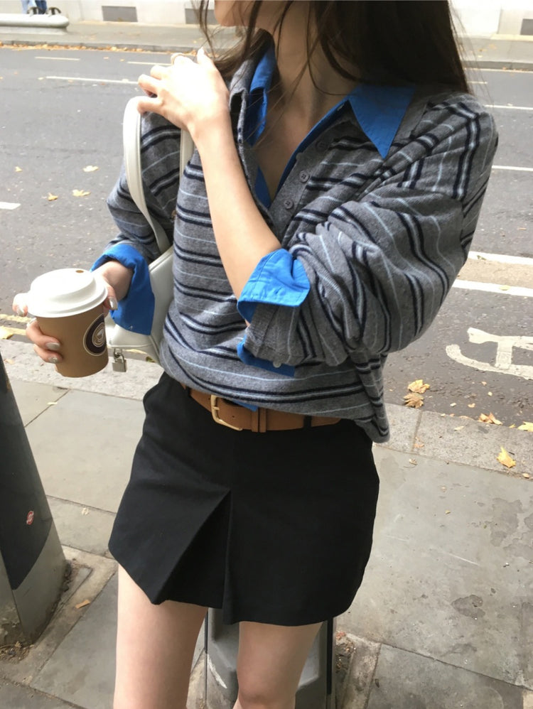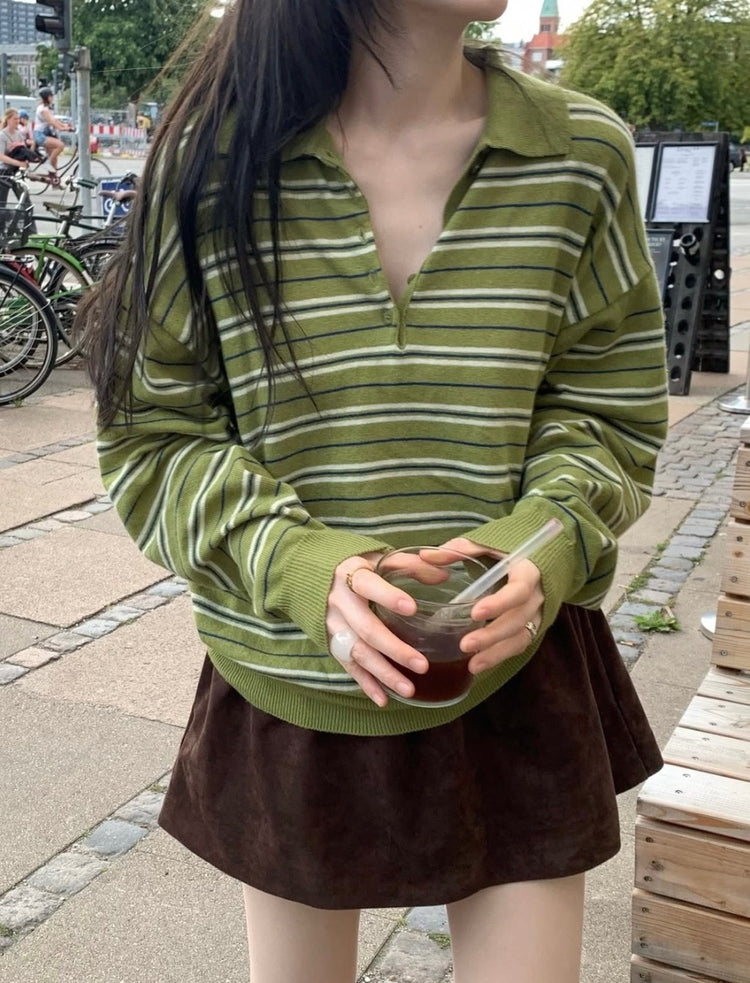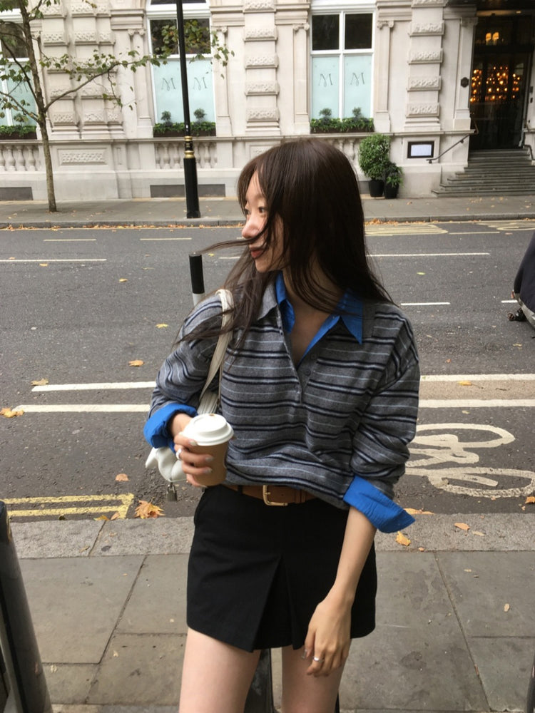翻領撞色條紋針織上衣