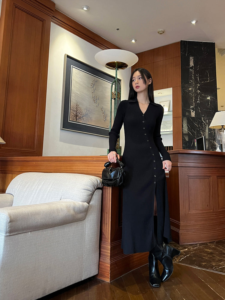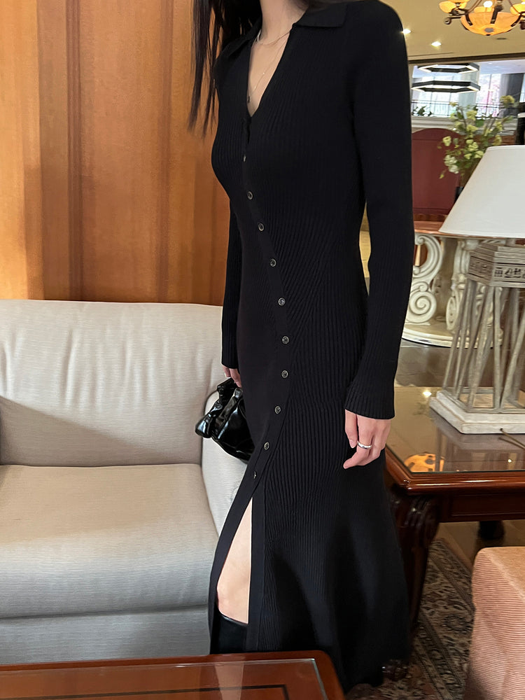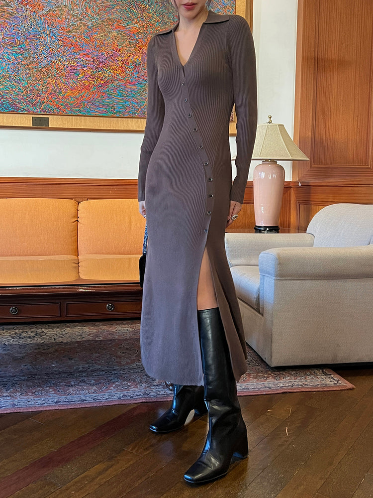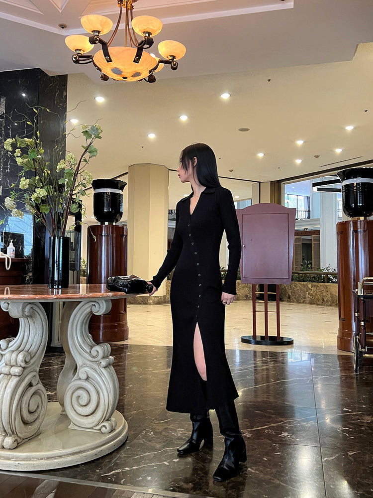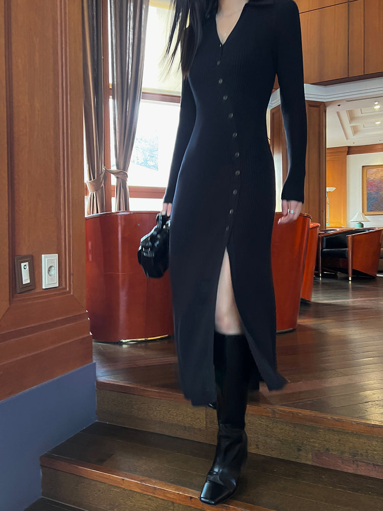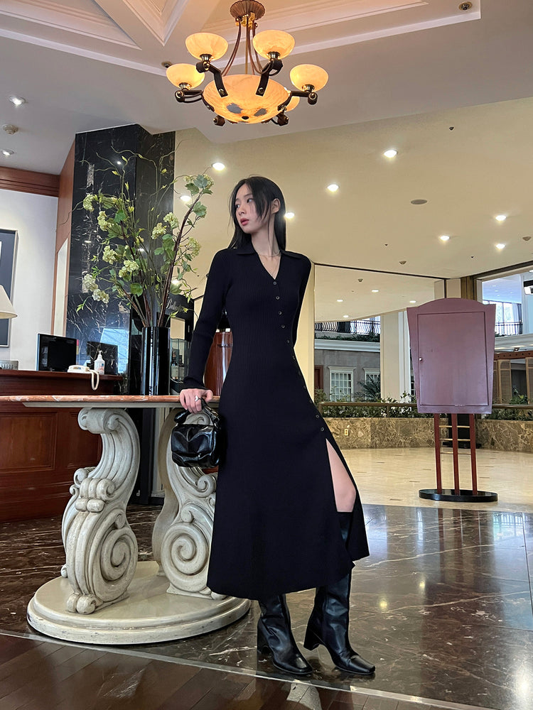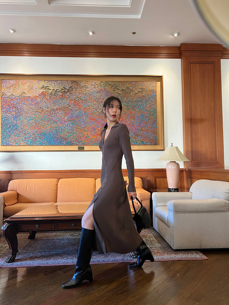 高質側開叉弧線排鈕連身裙