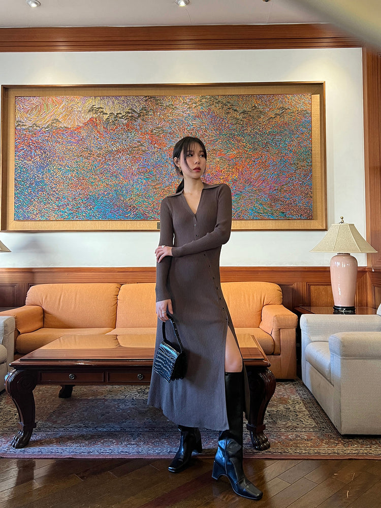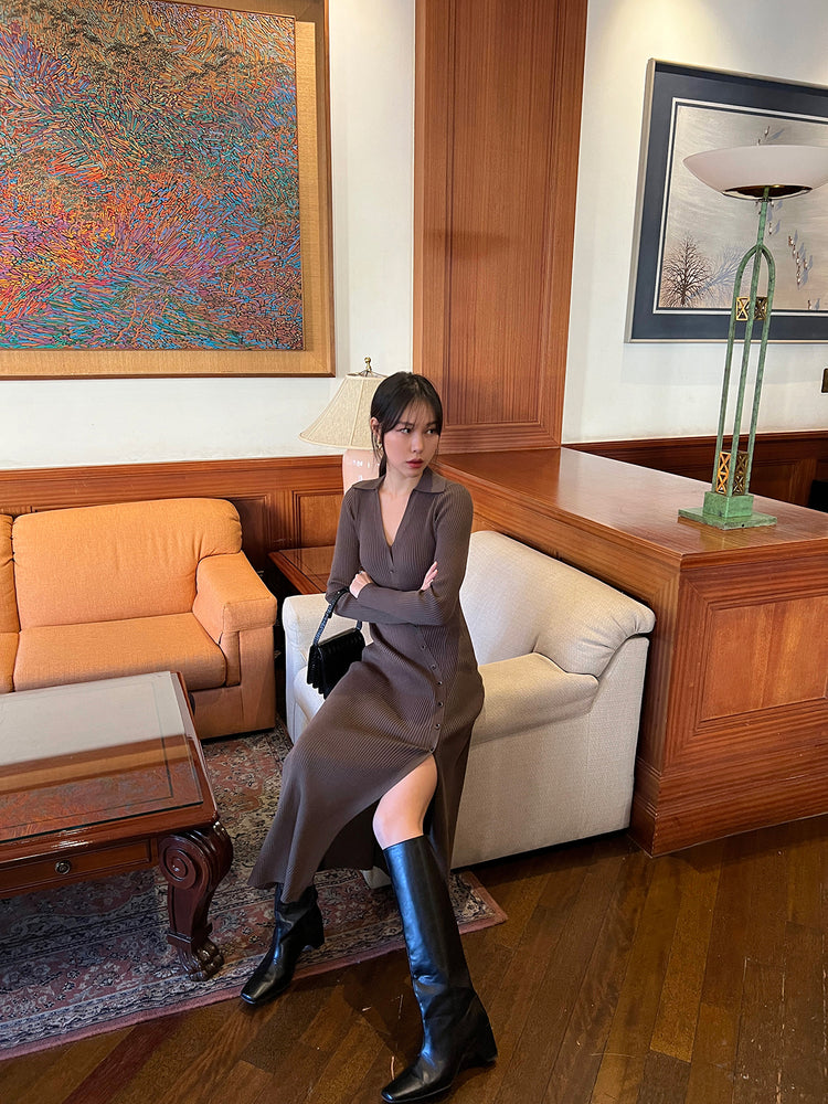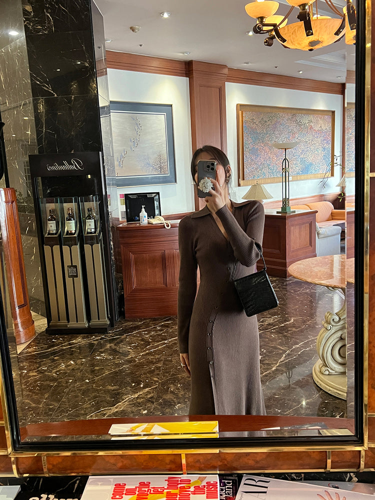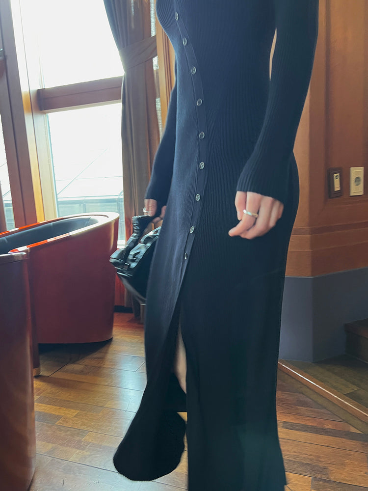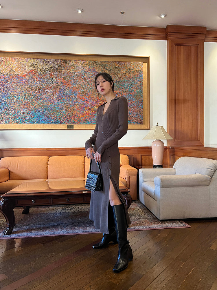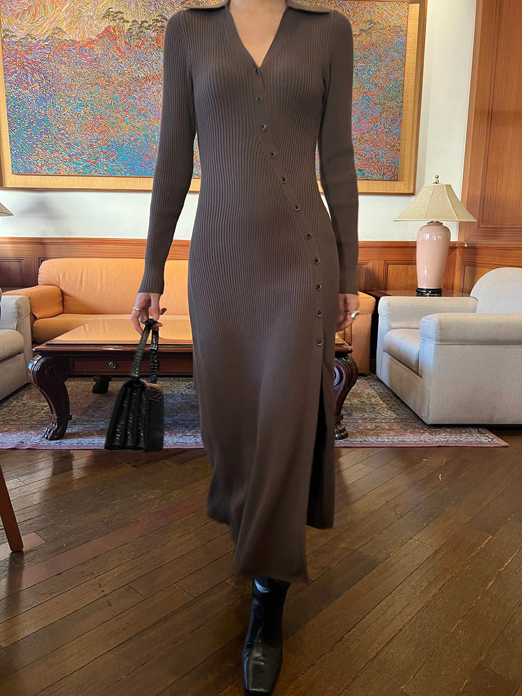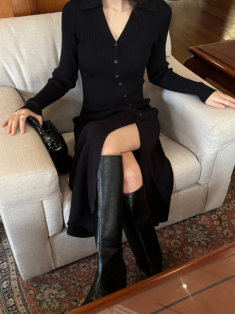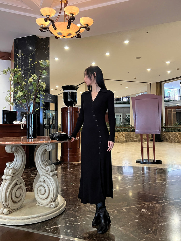 高質側開叉弧線排鈕連身裙