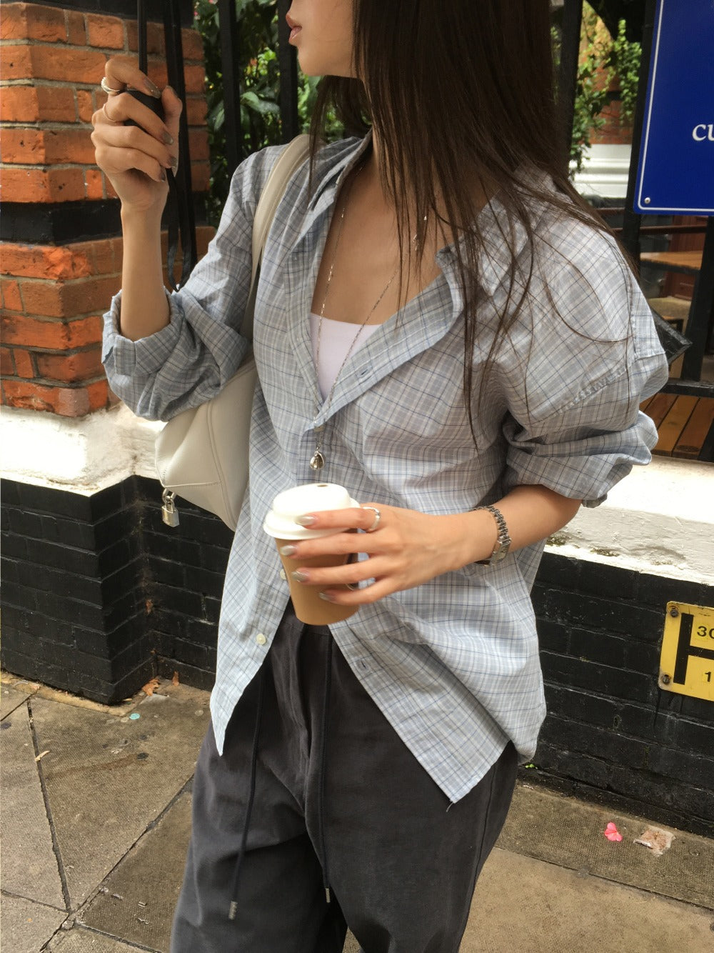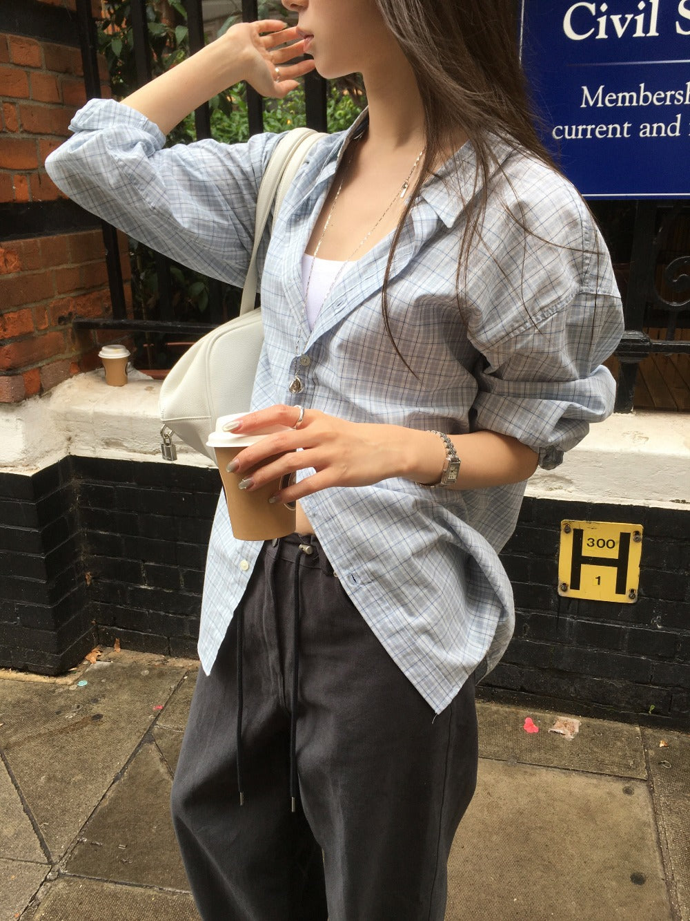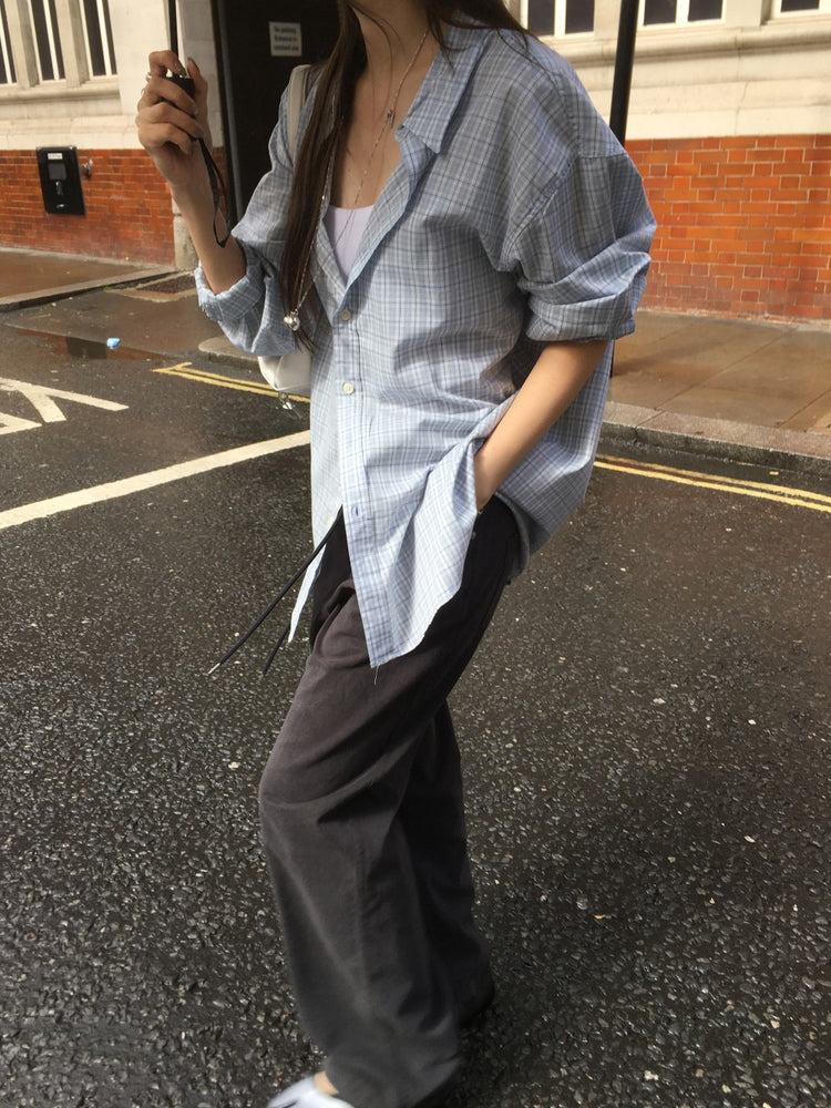 Unisex美色格紋寬鬆襯衫